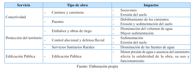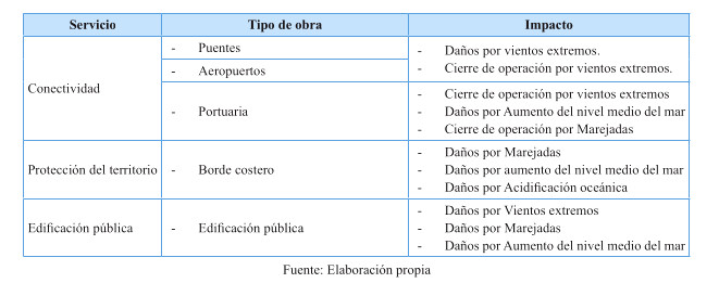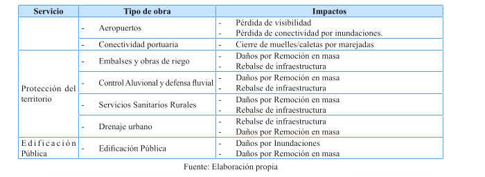 Tabla 13: Potenciales impactos de las amenazas climáticas sobre los servicios de infraestructura y edificación pública