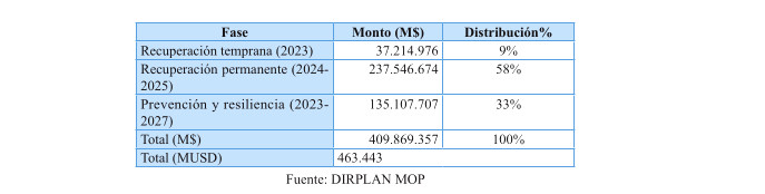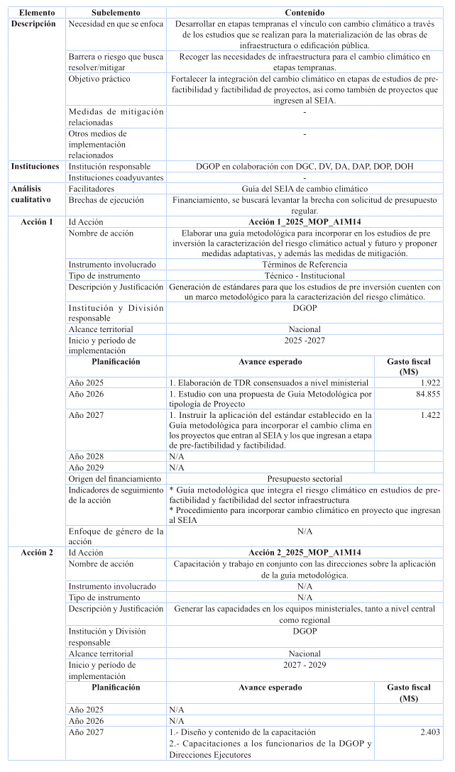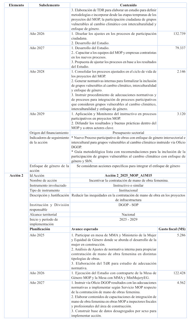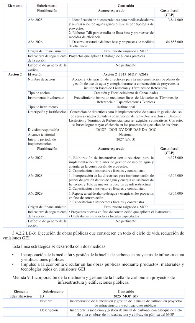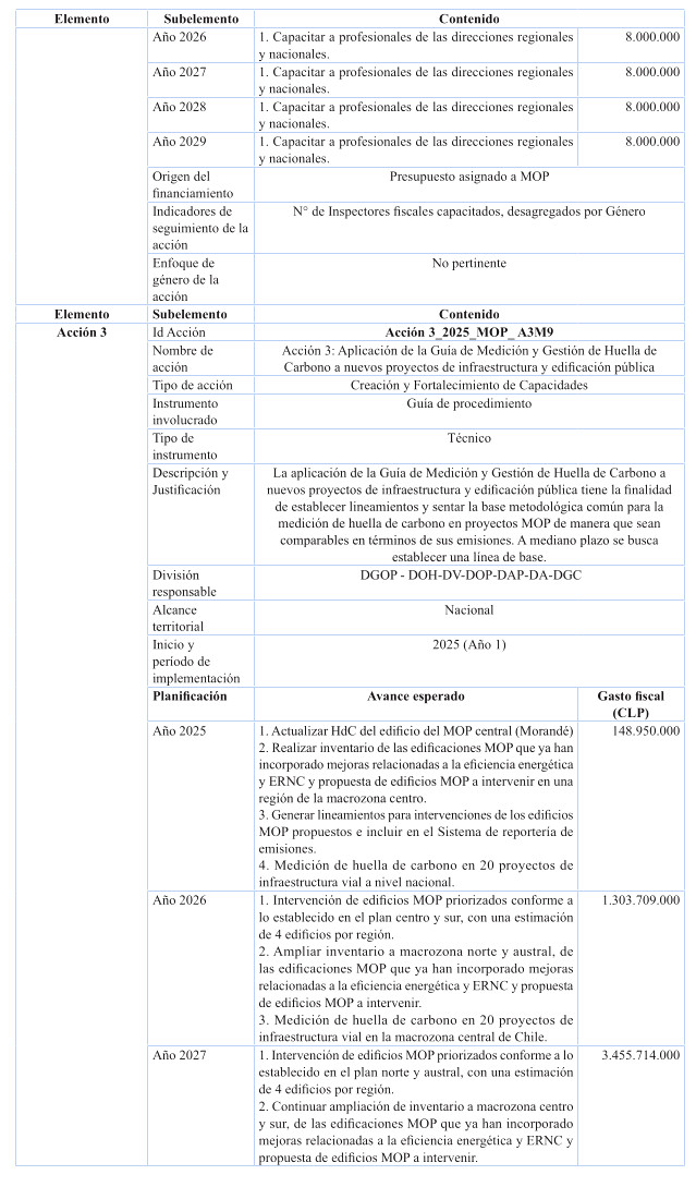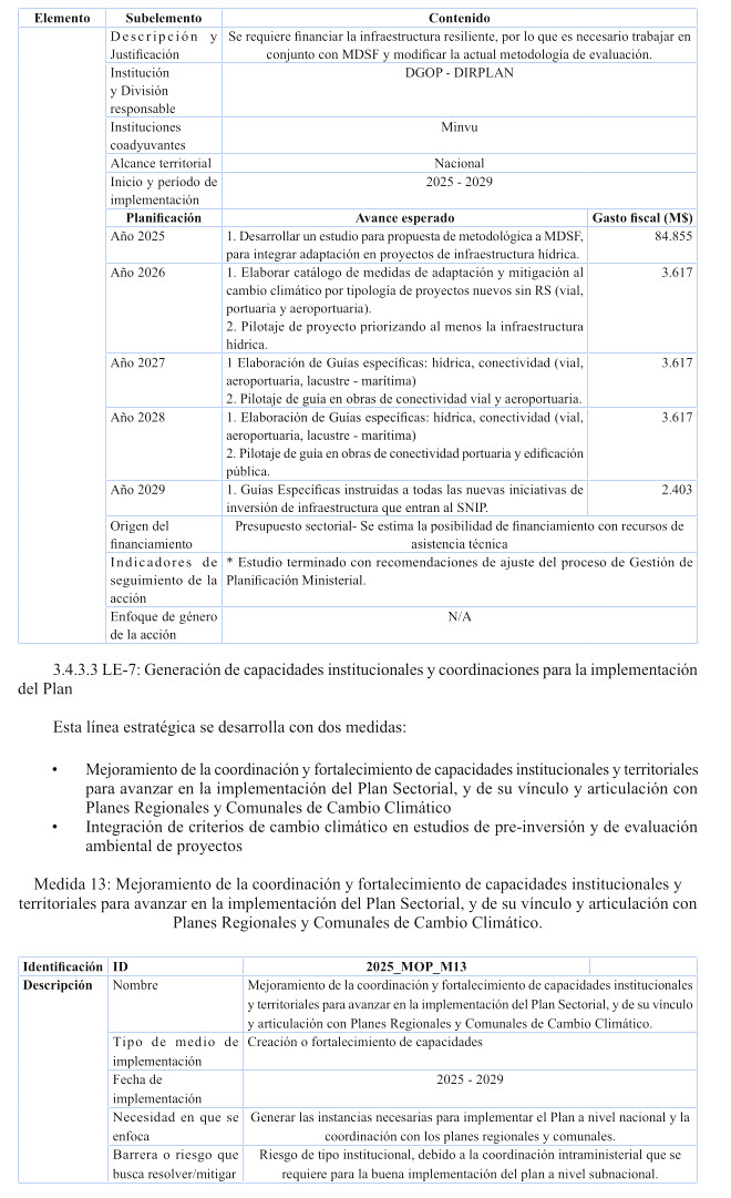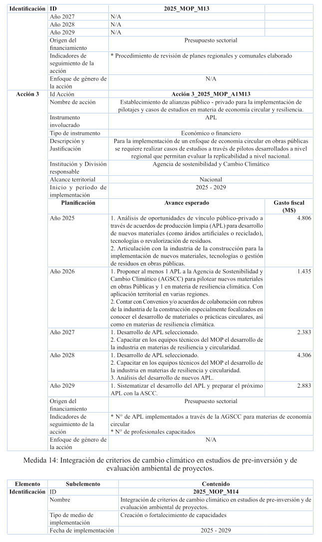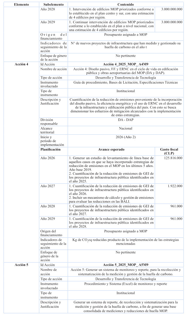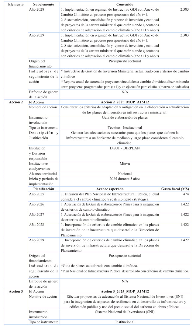Cabe destacar, que en relación a inversión, el plan contiene estudios básicos de las Direcciones de Planeamiento, Vialidad y Obras Hidráulicas, relacionados con resiliencia climática e integrados a la nómina de respaldo del Proyecto de Ley de Presupuestos 2025; y se ha incluido además el costeo de iniciativas de conservación de edificación pública MOP a lo largo del período del Plan, conforme al presupuesto habitual anual destinado a la Dirección de Arquitectura para ese propósito, programada en forma diferenciada por regiones, teniendo por foco las obras de conservación necesarias para reducir y gestionar la huella de carbono e incrementar la eficiencia energética en los edificios MOP de las 16 regiones del país, para efectos de cumplir con las metas de mitigación establecidas en el Plan para los próximos 5 años.