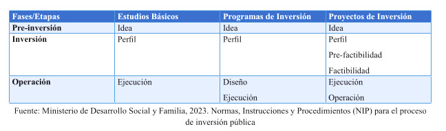 "El ciclo de vida de una inversión se entiende como el proceso de transformación de ideas, surgidas de la detección de necesidades, problemas u oportunidades, en soluciones para la provisión de bienes o servicios que mejor resuelvan esas necesidades, problemas u oportunidades. En el ámbito del Sistema Nacional de Inversiones, el ciclo de vida comprende el paso de las iniciativas de inversión a través de tres fases: pre-inversión, inversión y operación. Para cada una de ellas se definen distintas etapas a cumplir, que van desde la concepción de una idea hasta lo que se define como operación, que es cuando esa iniciativa entrega bienes y/o servicios respectivos".