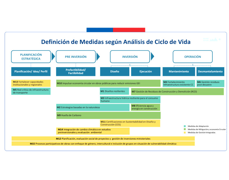 La determinación de las medidas de adaptación, mitigación y de medios de implementación han sido elaborados en consideración del ciclo de vida de los proyectos, acorde a la definición establecida por el Ministerio de Desarrollo Social (2023):