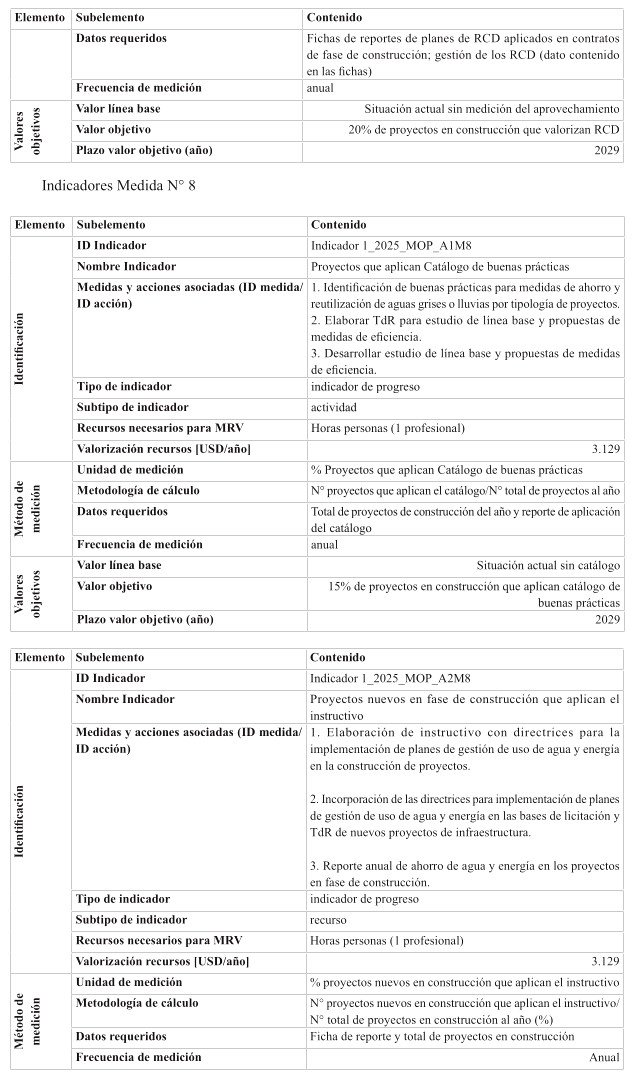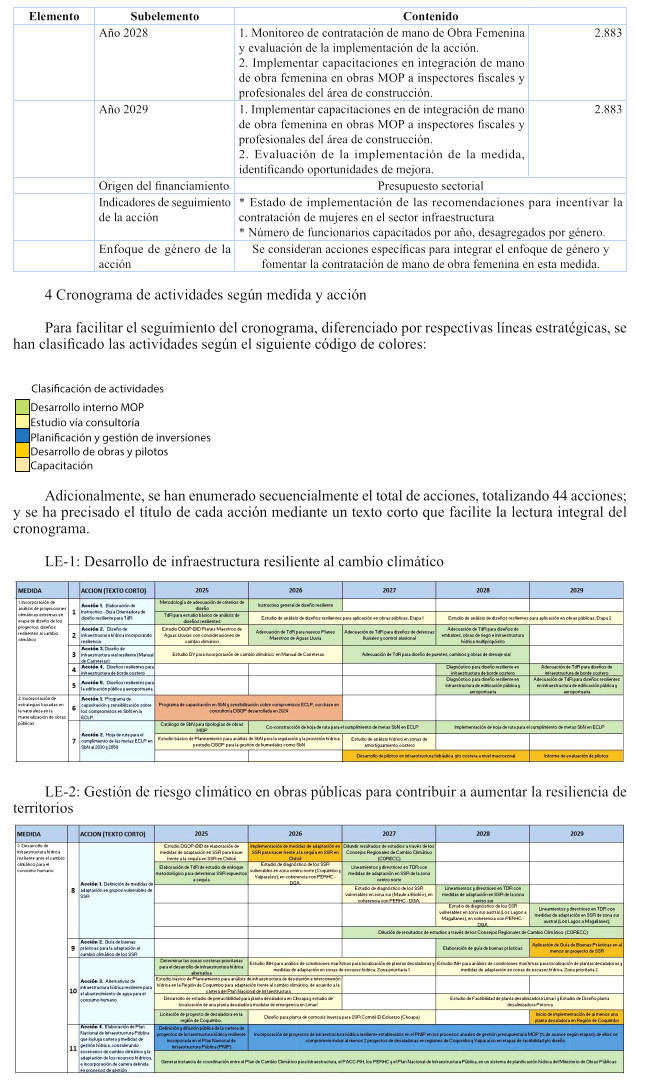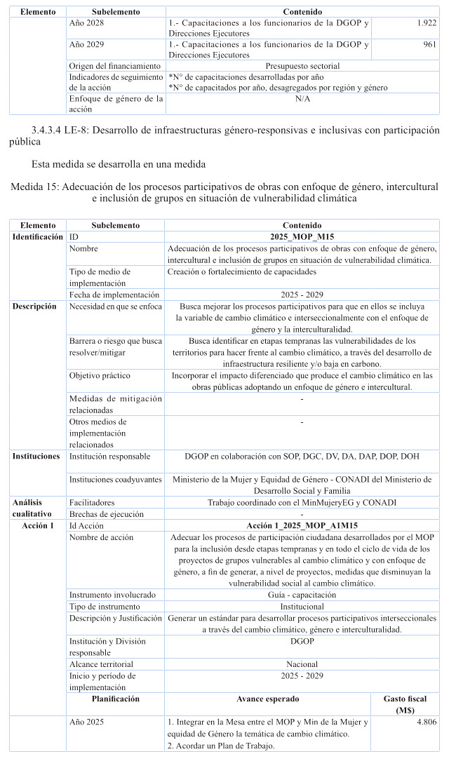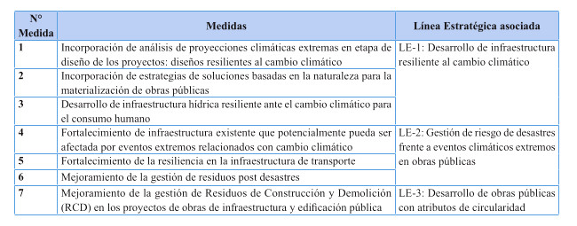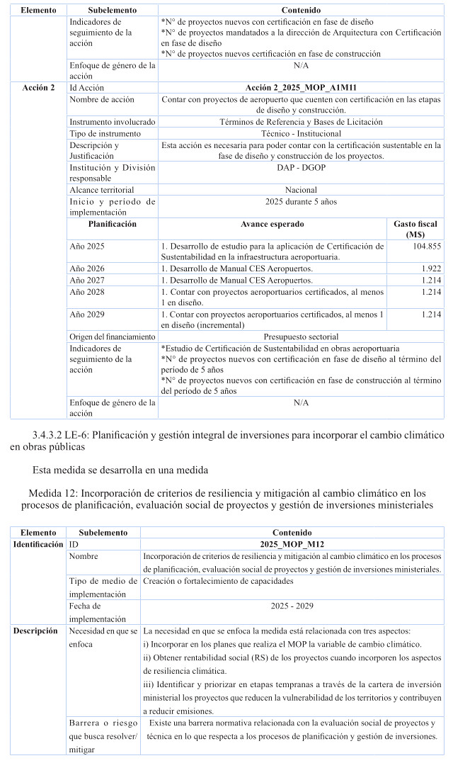 Es por ello, que se presentan medidas de carácter transversales que aplican a todo el ministerio como es el caso de las medidas de diseños resilientes, soluciones basadas en la naturaleza. Además, se contemplan medidas efectivas para atender en forma oportuna las amenazas más urgentes del país, como lo es la sequía y las precipitaciones extremas que desencadenan desastres, y se atienden a través de medidas para la provisión de agua para el consumo humano, mejoramiento sostenido de la infraestructura existente y futura.