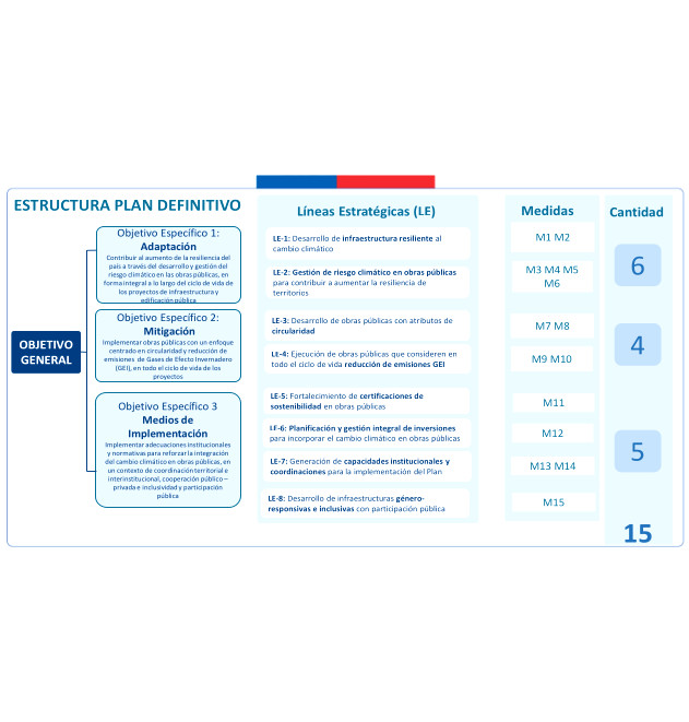 Durante el año 2022 el MOP instituyó una Unidad de Cambio Climático, atendiendo a la importancia de esta temática dentro de la institución, lo cual fue reforzado en el año 2023, al adecuarse la orgánica institucional de la Dirección General de Obras Públicas (DGOP), conformando la División de Infraestructura Sostenible, con el objeto de abordar desde una perspectiva integral el desarrollo sostenible de las obras públicas. A partir de esta decisión, se elevó el estándar de la Unidad a Departamento de Cambio Climático y Economía Circular, teniendo por objetivo "asesorar en la incorporación de cambio climático y economía circular en el quehacer del Ministerio de Obras Públicas, con la finalidad de avanzar en obras públicas resilientes y bajas en carbono" (MOP, 2023).