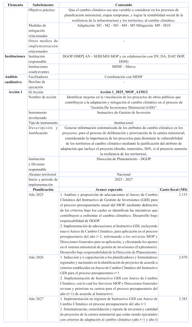 Tiene por objetivo integrar la consideración del cambio climático durante los procesos de planificación y priorización de proyectos, y en la gestión anual de inversiones acorde al ciclo de vida de las iniciativas. Esto implica la incorporación del cambio climático en los procesos de toma de decisión de la institución, adecuaciones en la evaluación social de proyectos en coordinación con el Ministerio de Desarrollo Social y Familia, la consideración de medidas de adaptación en etapas tempranas y el resguardo de la coherencia y pertinencia territorial de los esfuerzos sectoriales de adaptación y mitigación.