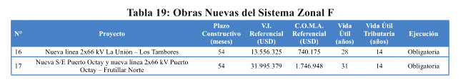 El siguiente cuadro presenta las obras nuevas de expansión necesarias para el Sistema F de Transmisión Zonal.