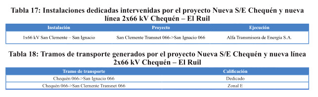Adicionalmente, el proyecto contempla la construcción de los enlaces que corresponda para el seccionamiento de la línea antes mencionada en la subestación Chequén, manteniendo, al menos, las características de las líneas que se seccionan con excepción del enlace que conecte la nueva subestación Chequén con el tramo de línea hacia la subestación San Clemente en 66 kV, el cual deberá permitir una capacidad de transmisión de, al menos, 90 MVA por circuito a 35°C temperatura ambiente con sol.
