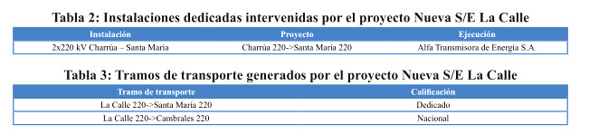 Adicionalmente, el proyecto contempla la construcción de los enlaces que corresponda para realizar el seccionamiento de las líneas antes mencionadas en la subestación La Calle, manteniendo, al menos, las características técnicas del tramo que se secciona en el caso de la línea 2x220 kV Santa María – Charrúa y en el caso del enlace resultante hacia subestación Charrúa del seccionamiento del actual circuito 1x220 kV Hualqui – Charrúa, el cual deberá considerar estructuras de doble circuito con tendido del primer circuito. Por su parte, el enlace de seccionamiento hacia subestación Hualqui, deberá considerar estructuras de doble circuito y permitir una capacidad de transmisión de, al menos, 700 MVA por circuito a 35°C temperatura ambiente con sol. Todos los enlaces mencionados anteriormente deberán considerar la construcción de sus paños de conexión en la subestación La Calle incluyendo el paño asociado a la conexión del tendido del segundo circuito de la línea Lagunillas – Hualqui – La Calle.