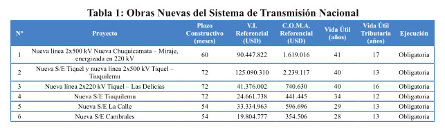 El siguiente cuadro presenta las obras nuevas contenidas en el Plan de Expansión 2024 del Sistema de Transmisión Nacional, las que deberán dar inicio a su licitación, adjudicación y construcción, conforme se indica a continuación: