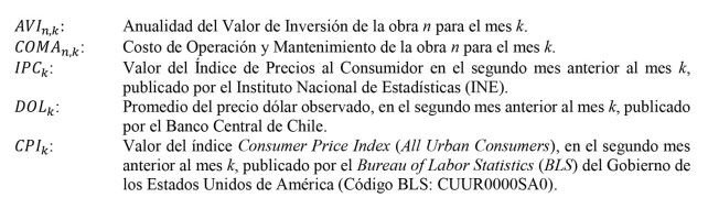 Artículo segundo: Establézcanse las fórmulas de indexación de la remuneración, que deberán ser aplicadas a la Anualidad del Valor de Inversión ( AVI n,0 ) y los Costos de Operación y Mantenimiento ( COMA n,0 ), que se fijarán mediante los decretos a que hace referencia el artículo 96° de la Ley, de los proyectos que resulten adjudicados como resultado del o los procesos de licitación llevados a cabo por el Coordinador Eléctrico Nacional, serán las que se señalan a continuación: