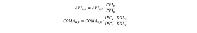 de las fórmulas anteriores, éstos corresponden al del segundo mes anterior al mes del último día de recepción de las ofertas económicas según se establezca en las Bases de Licitación elaboradas por el Coordinador Eléctrico Nacional, con el fin que, al último mes de la presentación de las ofertas económicas, la aplicación de las fórmulas de indexación para el A.V.I. y C.O.M.A. dé como resultado el A.V.I. y C.O.M.A. ofertado.