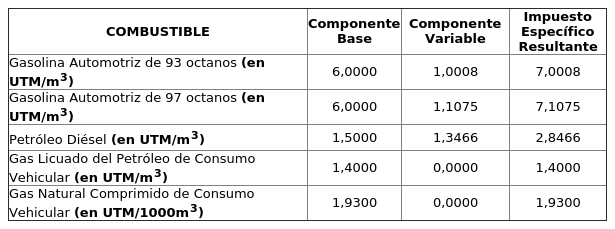 3.- Determínanse, como consecuencia de lo anterior, las tasas de los Impuestos Específicos de los Combustibles establecidos en la ley N° 18.502, los cuales serán iguales a su componente base, considerando además el componente variable, que puede ser sumado o restado según lo previsto en el artículo 3 de la ley N° 20.765 y lo dispuesto en el artículo 8 de su Reglamento.