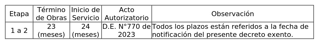 1. Autorízase a la concesionaria para ampliar los plazos de término de obras e inicio de servicio, en las comunas de Bulnes y Coihueco, Región de Ñuble, según se indica a continuación, autorizada por decreto exento Nº 770, de 2023.