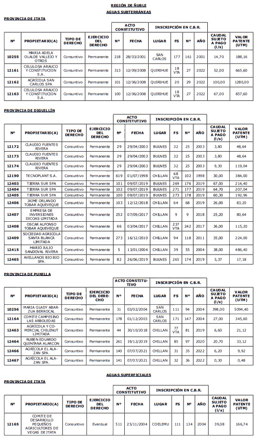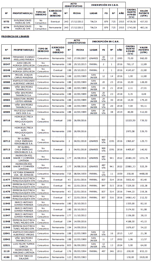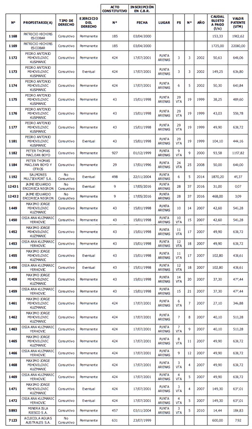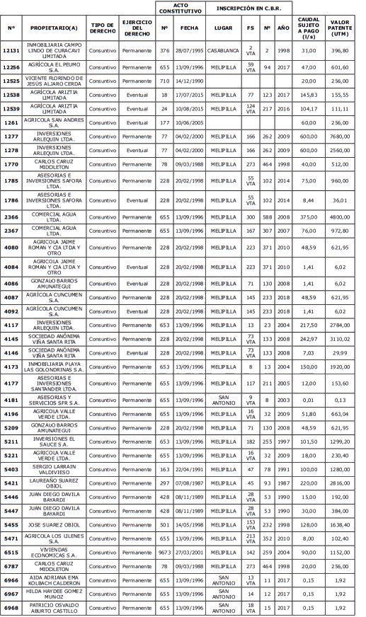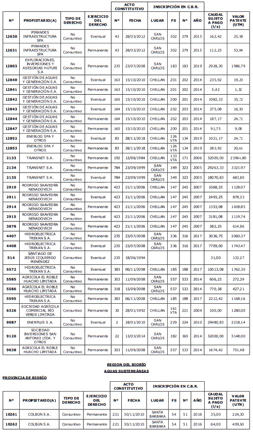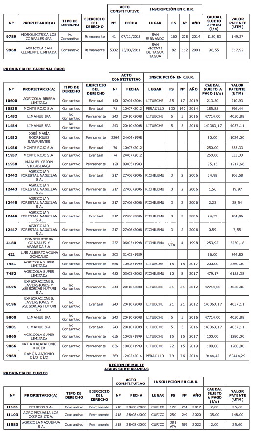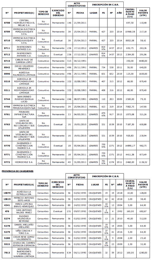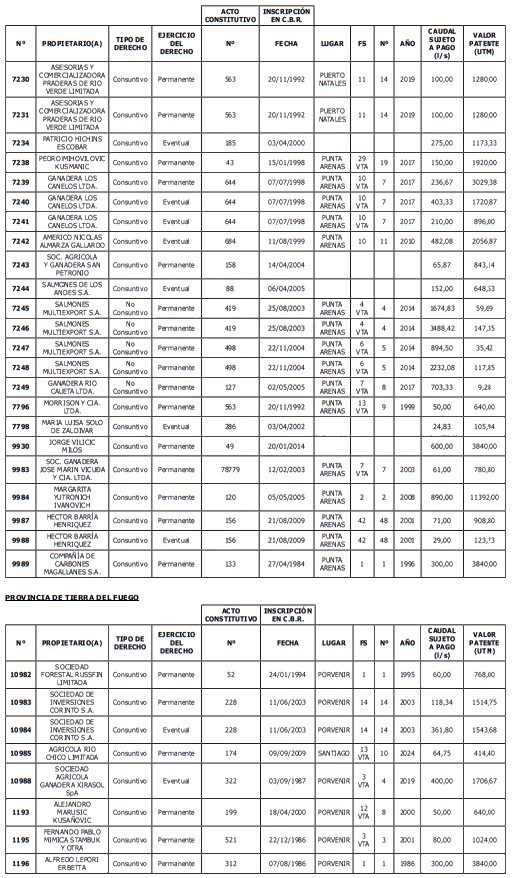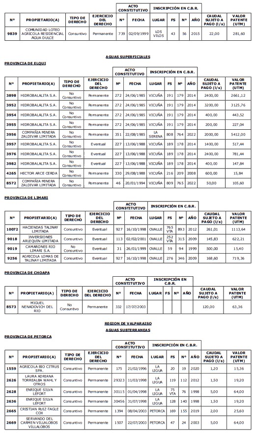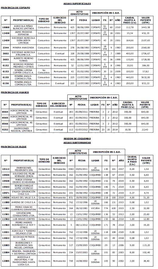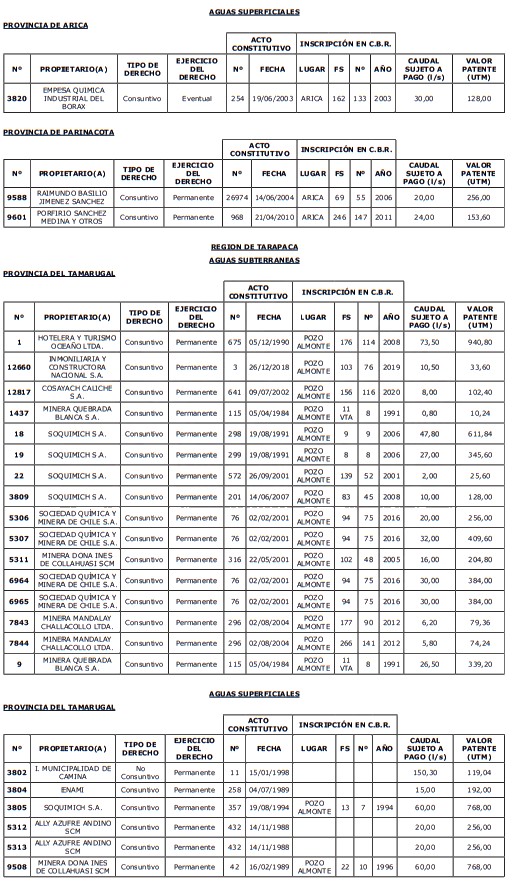 1. Fíjase el listado de derechos de aprovechamiento afectos al pago de patente a beneficio fiscal, por no utilización de las aguas, cuyos propietarios(as) ordenados(as) por región, naturaleza del agua y provincia son los que se señalan a continuación: