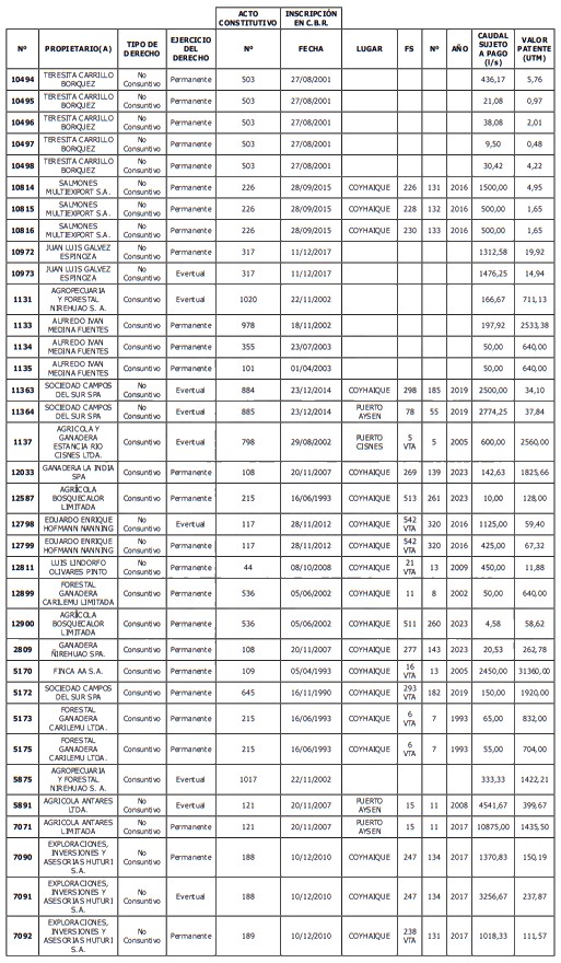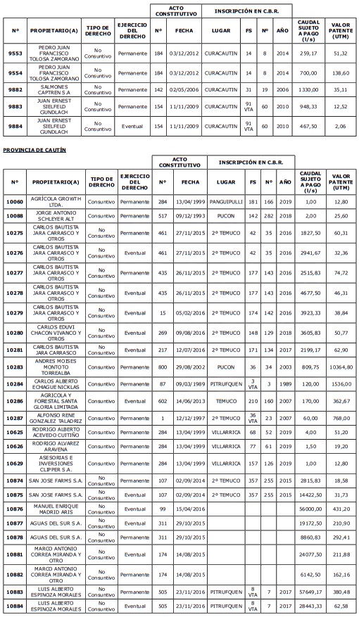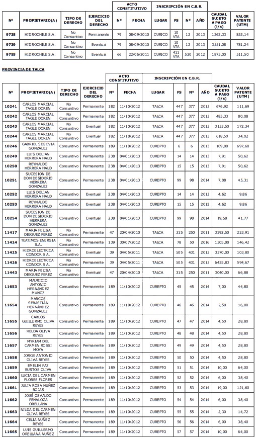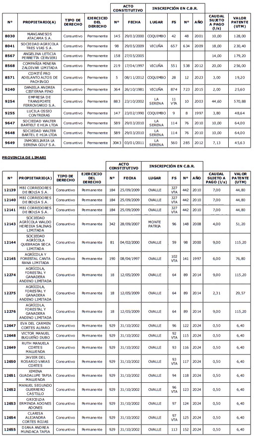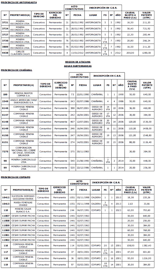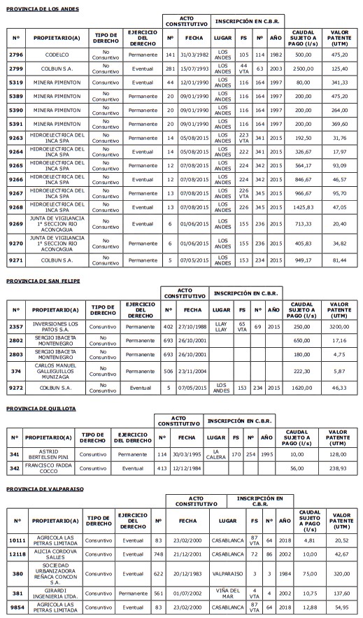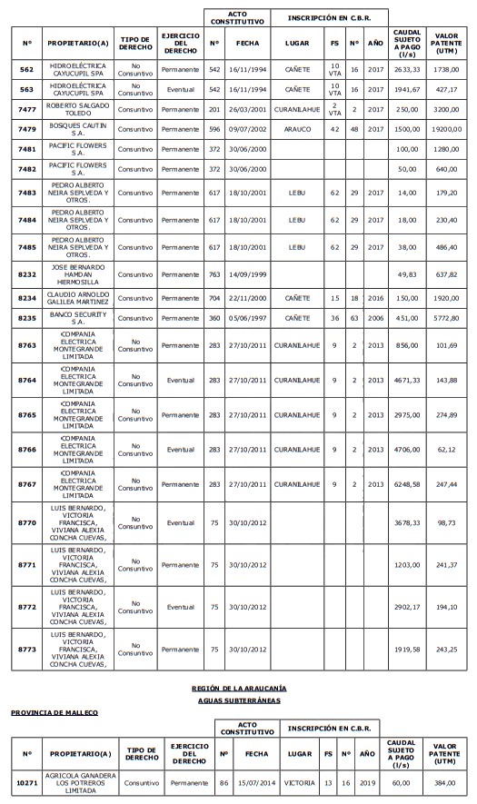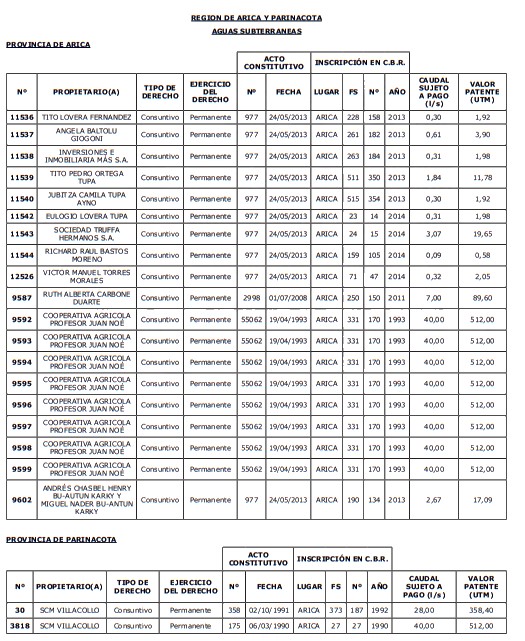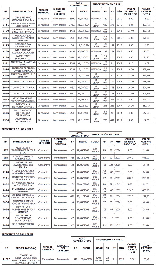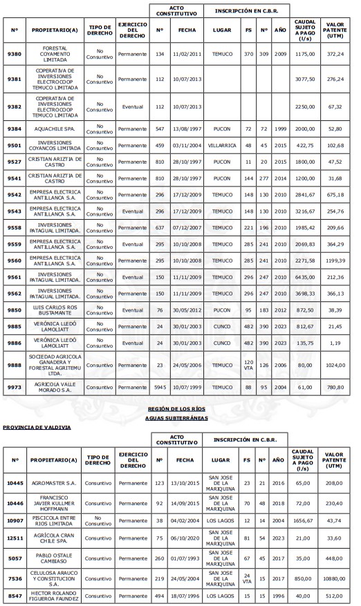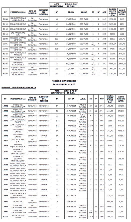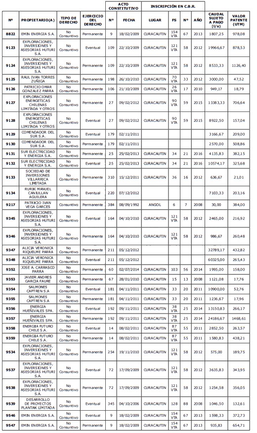1. Fíjase el listado de derechos de aprovechamiento afectos al pago de patente a beneficio fiscal, por no utilización de las aguas, cuyos propietarios(as) ordenados(as) por región, naturaleza del agua y provincia son los que se señalan a continuación:
