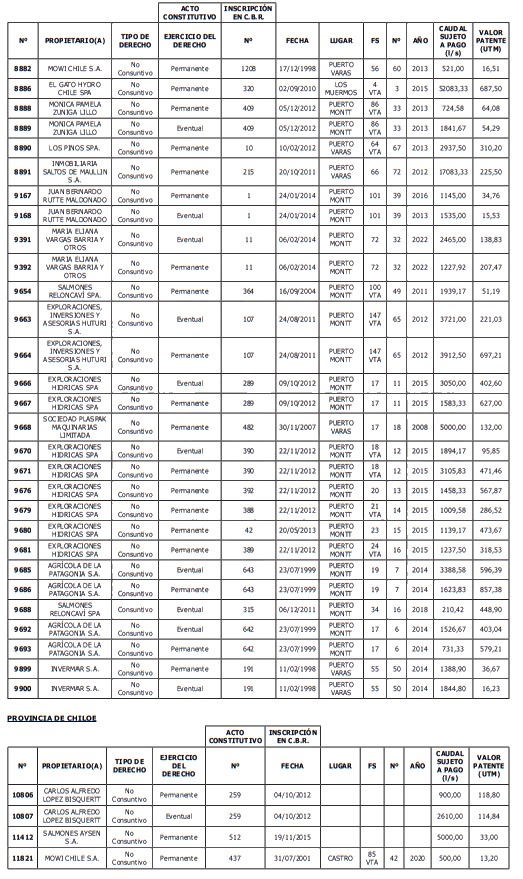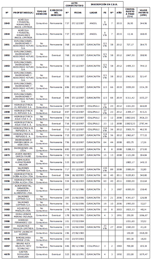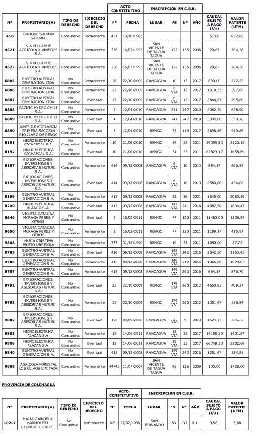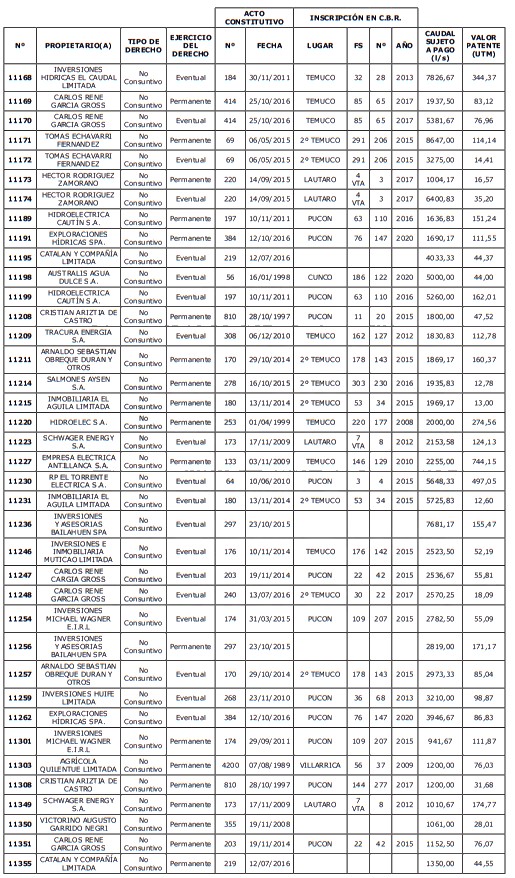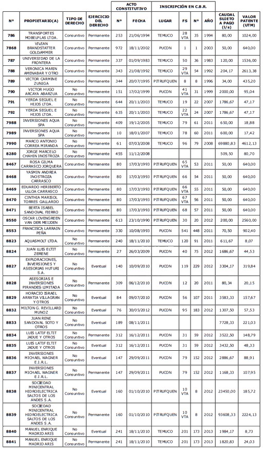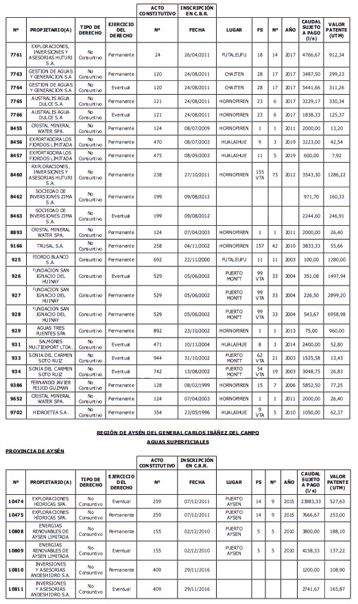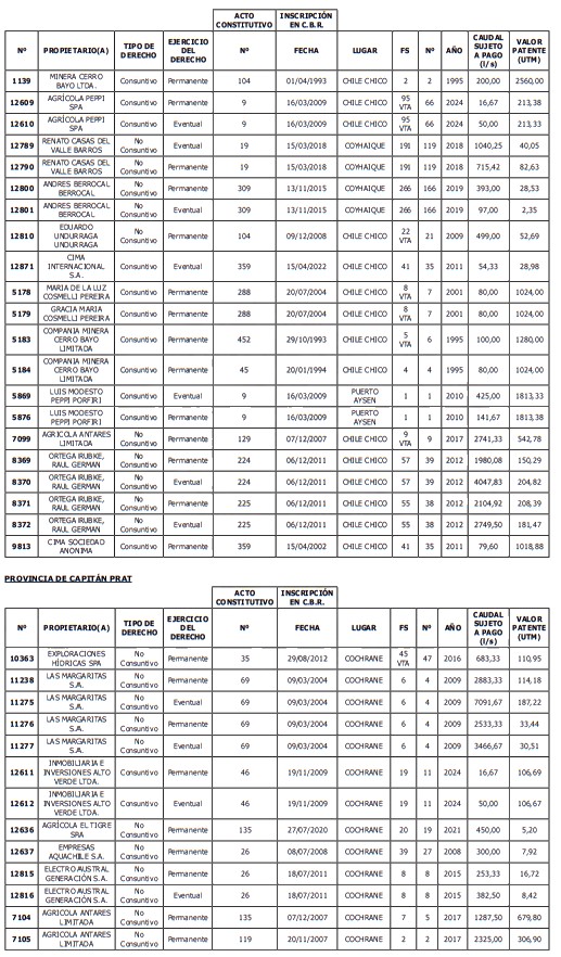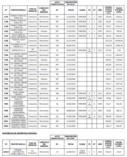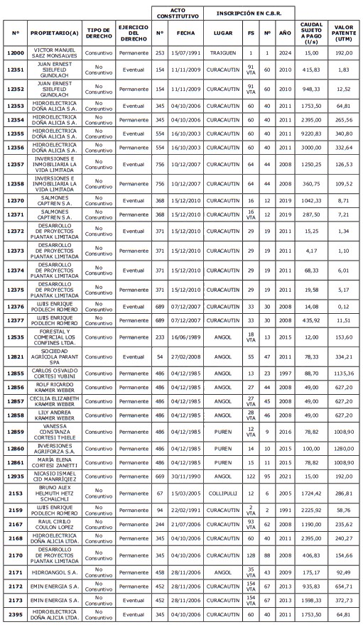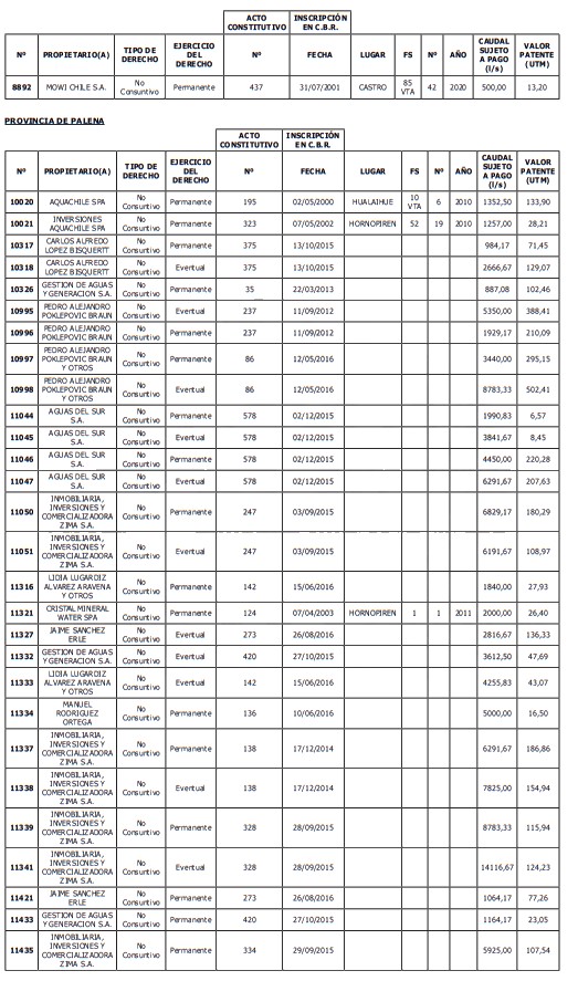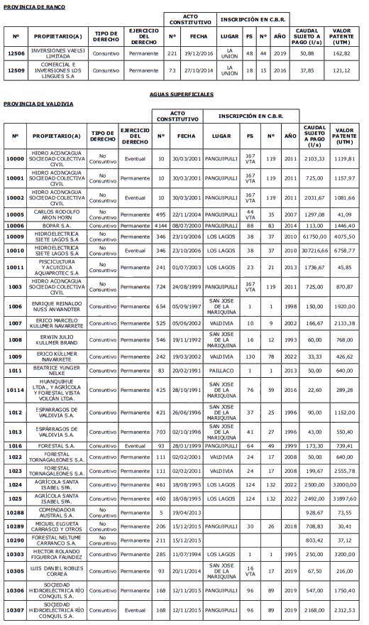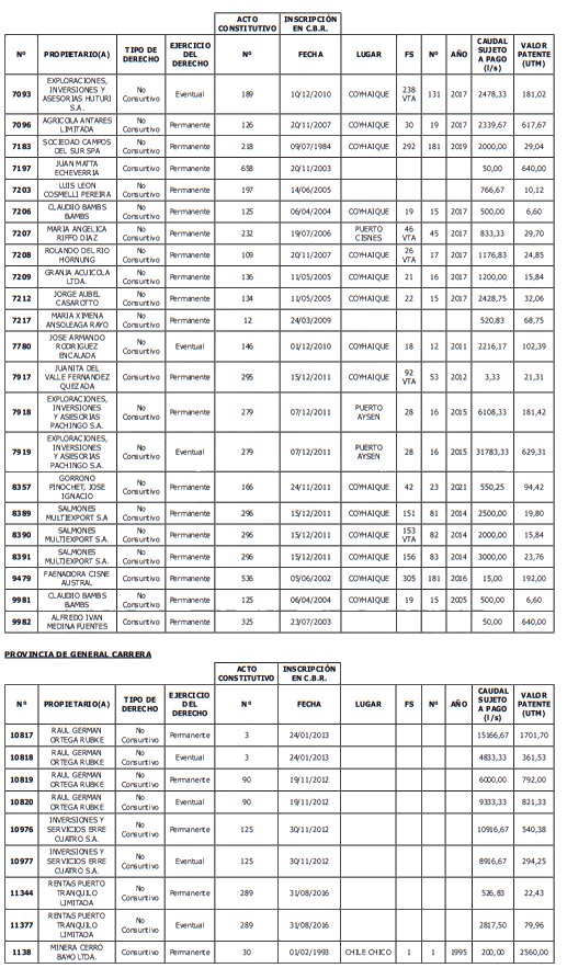 1. Fíjase el listado de derechos de aprovechamiento afectos al pago de patente a beneficio fiscal, por no utilización de las aguas, cuyos propietarios(as) ordenados(as) por región, naturaleza del agua y provincia son los que se señalan a continuación:
