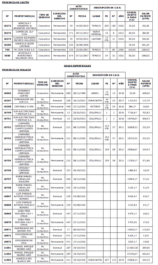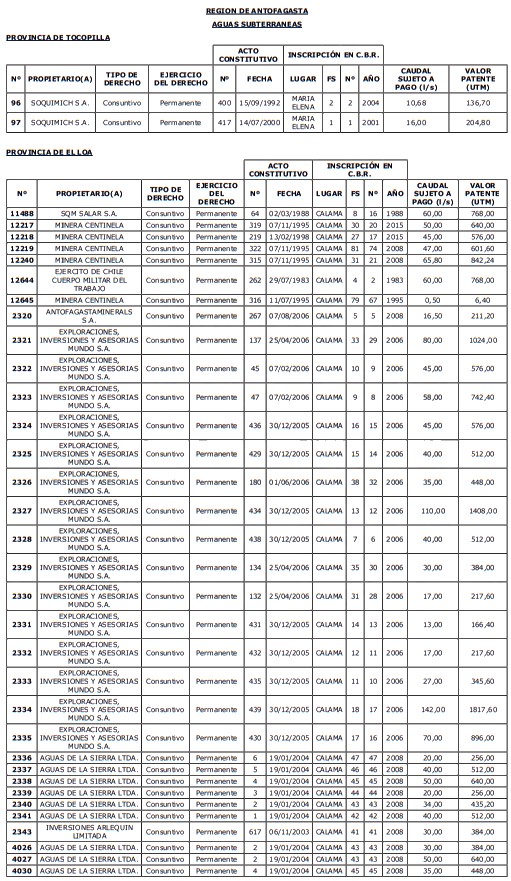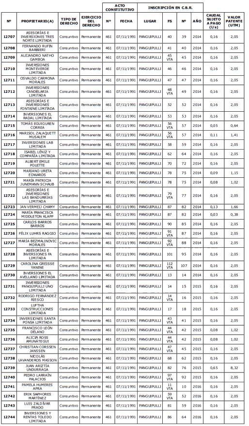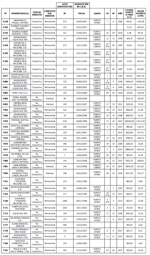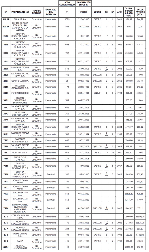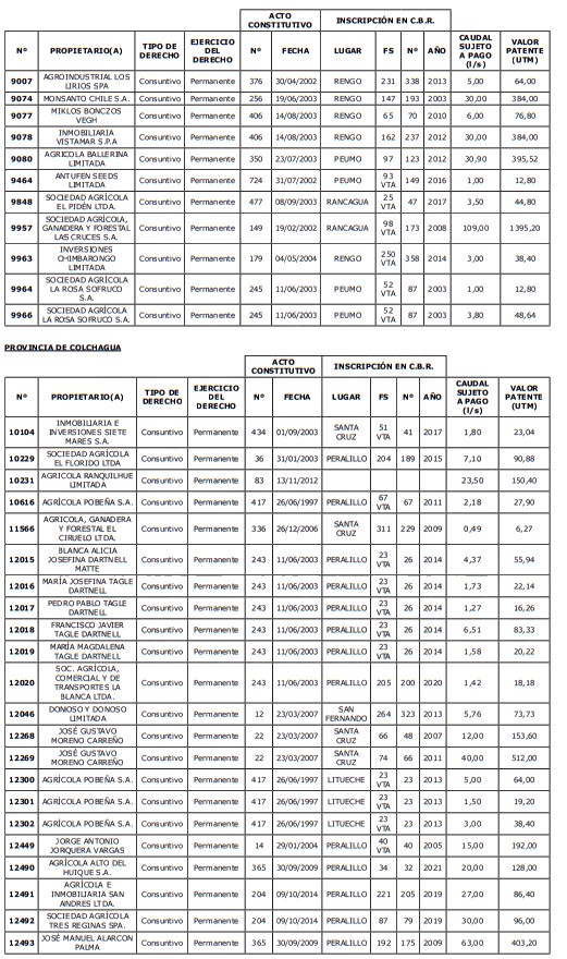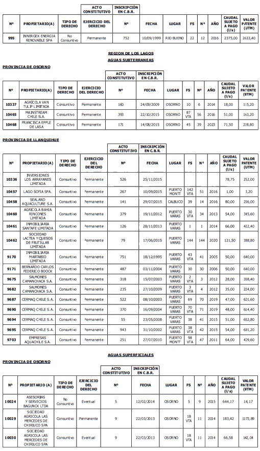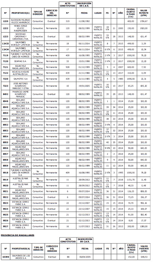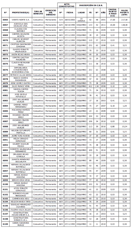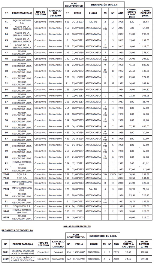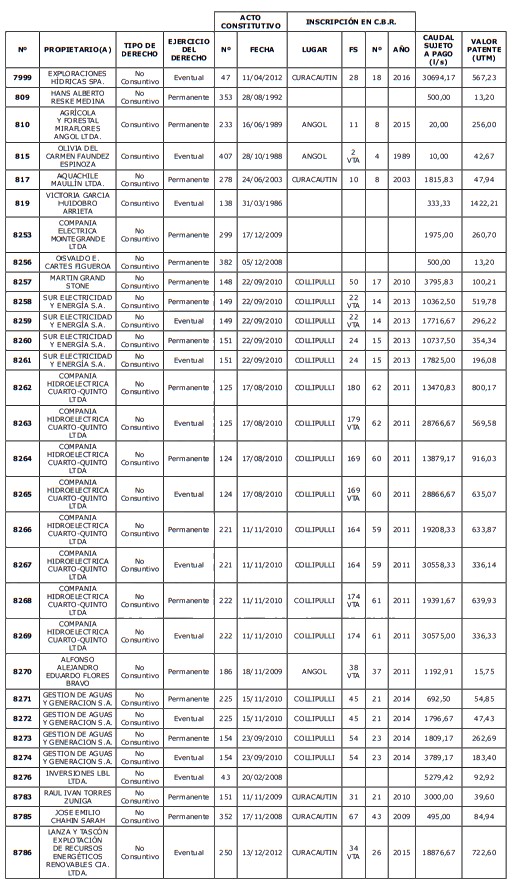 1. Fíjase el listado de derechos de aprovechamiento afectos al pago de patente a beneficio fiscal, por no utilización de las aguas, cuyos propietarios(as) ordenados(as) por región, naturaleza del agua y provincia son los que se señalan a continuación: