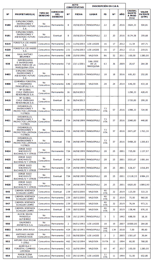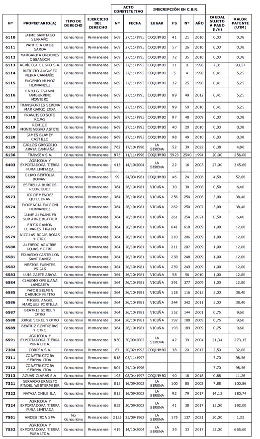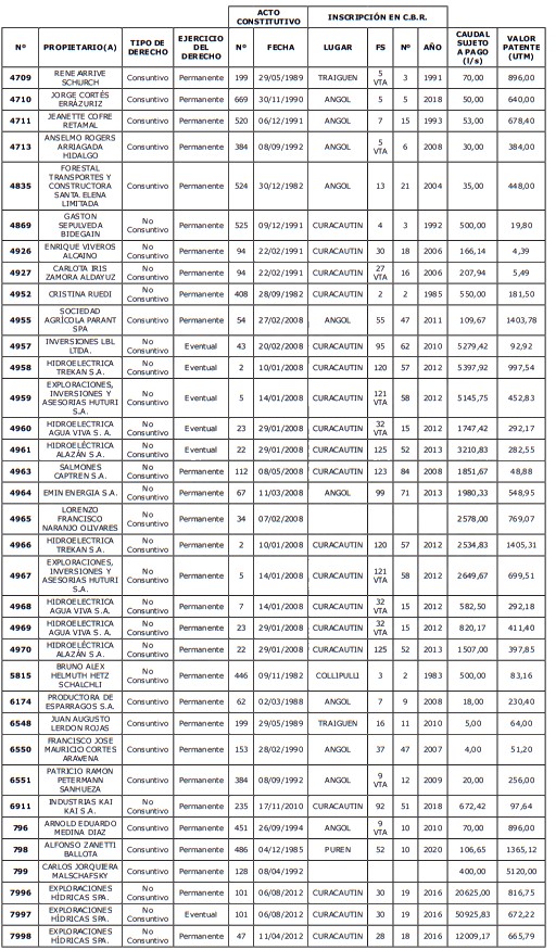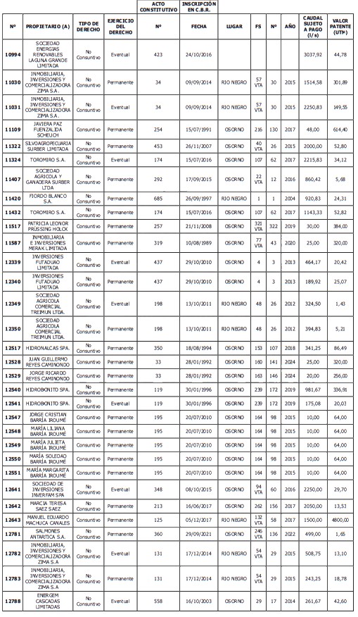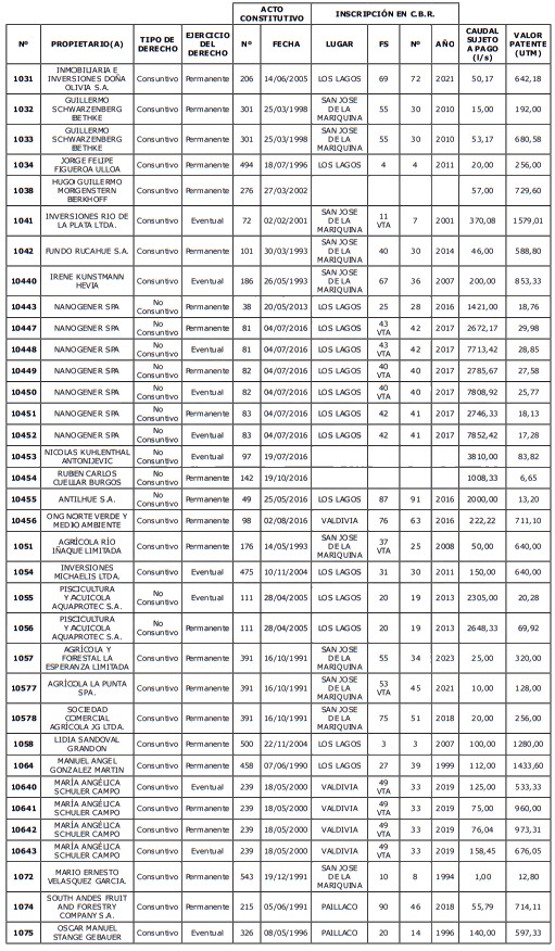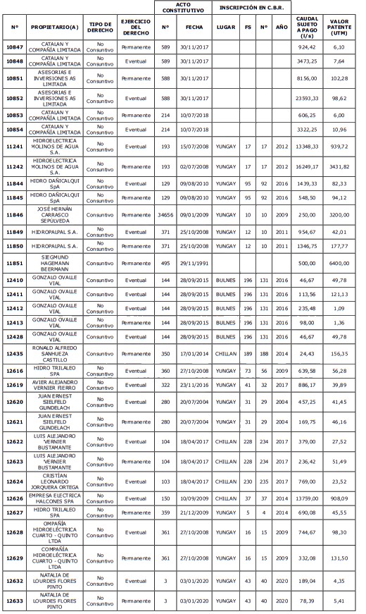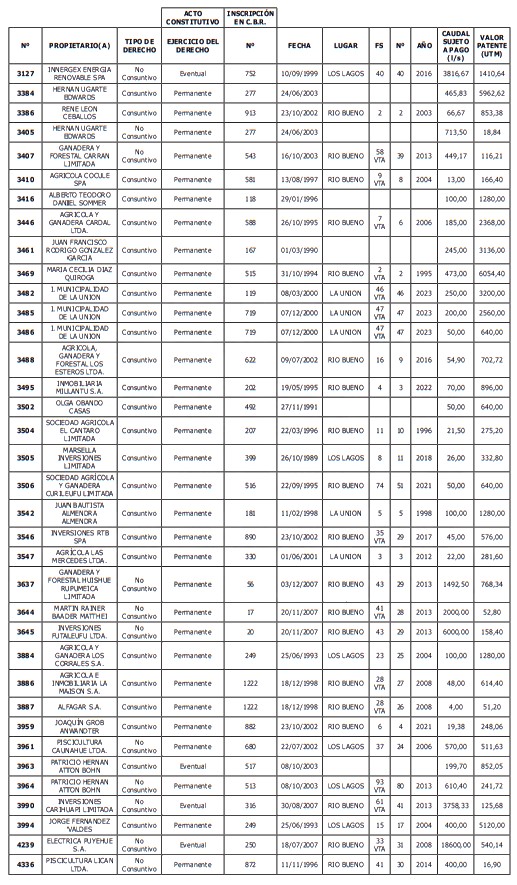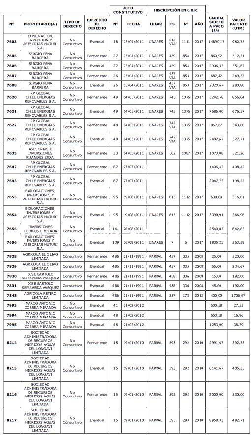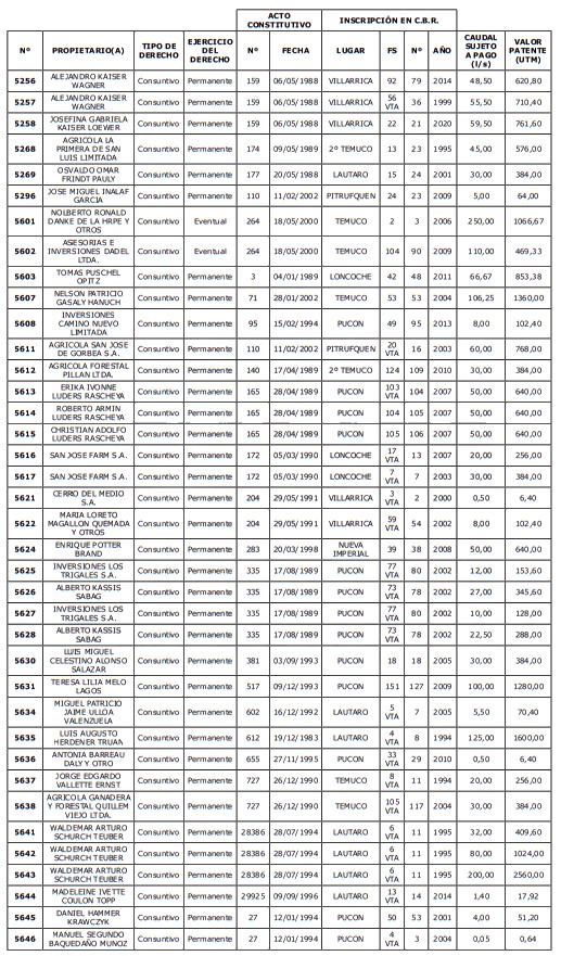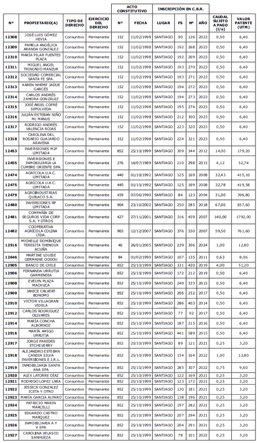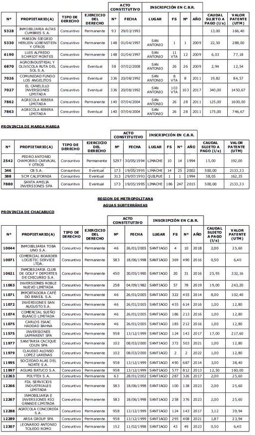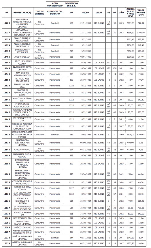 5. Déjase constancia que según establece el artículo 129 bis 7 del Código de Aguas, las personas, tanto naturales como jurídicas, que han sido identificadas en el presente listado, deberán pagar la patente dentro del mes de marzo de 2026 en cualquier banco o institución autorizada para recaudar tributos. Asimismo, de no mediar el pago en la fecha establecida para ello, se iniciará un procedimiento judicial para efectuar un remate público del respectivo derecho, conforme señala el artículo 129 bis 11 del mismo cuerpo legal.