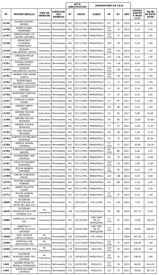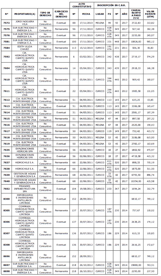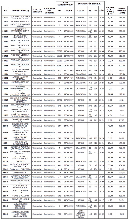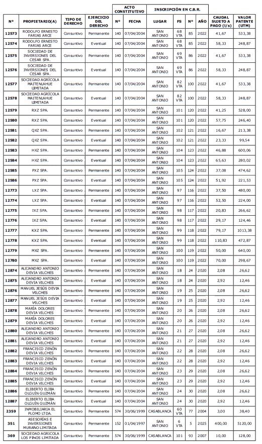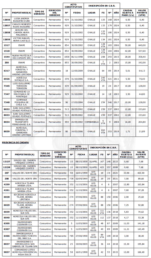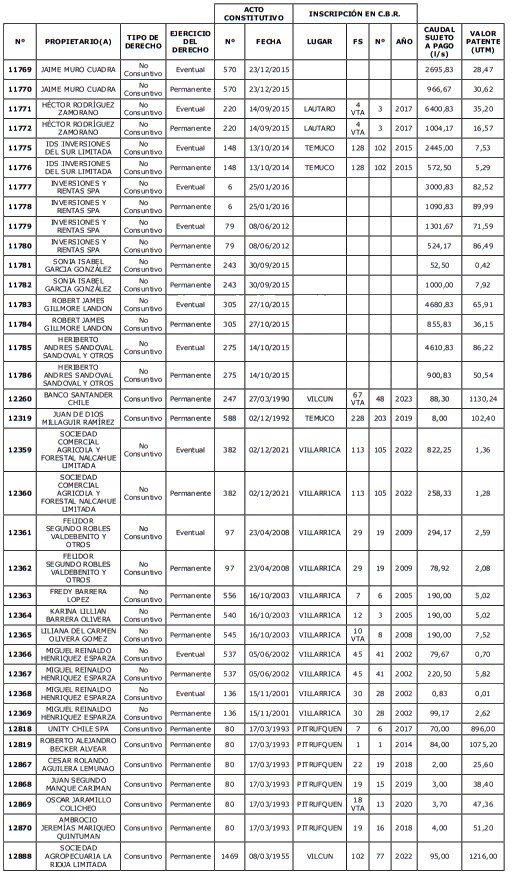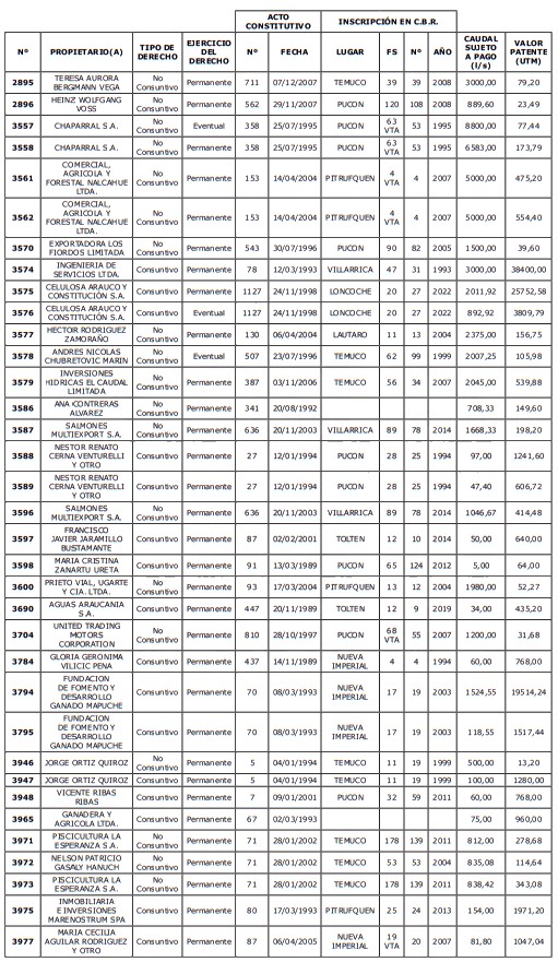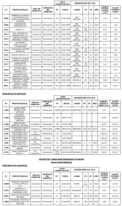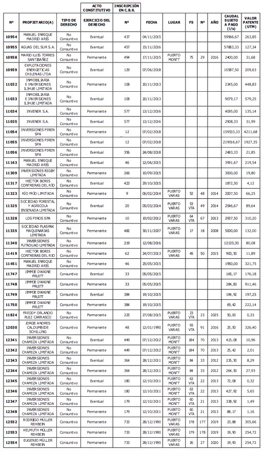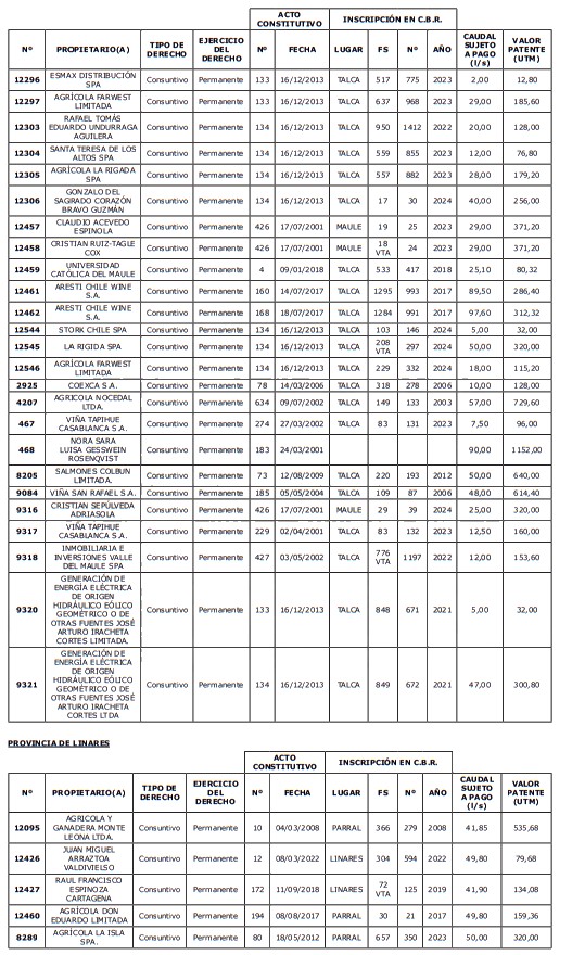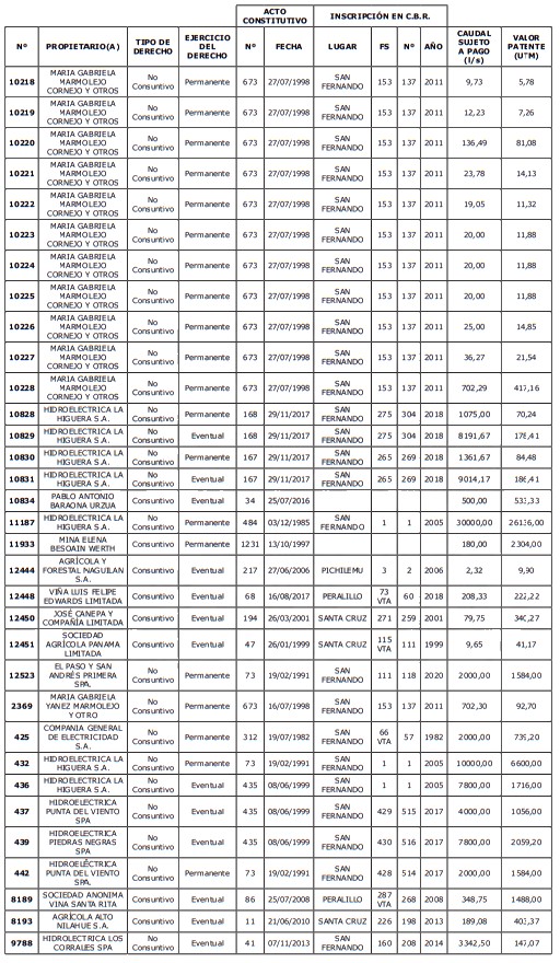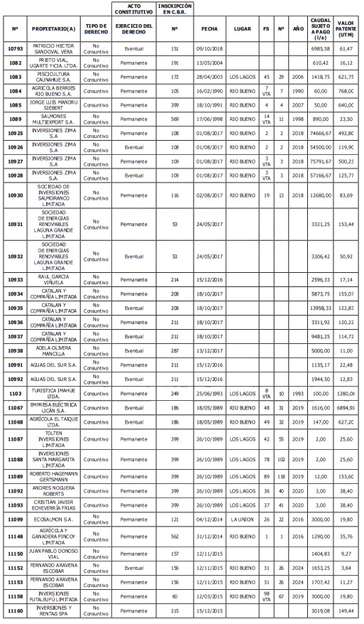 5. Déjase constancia que según establece el artículo 129 bis 7 del Código de Aguas, las personas, tanto naturales como jurídicas, que han sido identificadas en el presente listado, deberán pagar la patente dentro del mes de marzo de 2026 en cualquier banco o institución autorizada para recaudar tributos. Asimismo, de no mediar el pago en la fecha establecida para ello, se iniciará un procedimiento judicial para efectuar un remate público del respectivo derecho, conforme señala el artículo 129 bis 11 del mismo cuerpo legal.