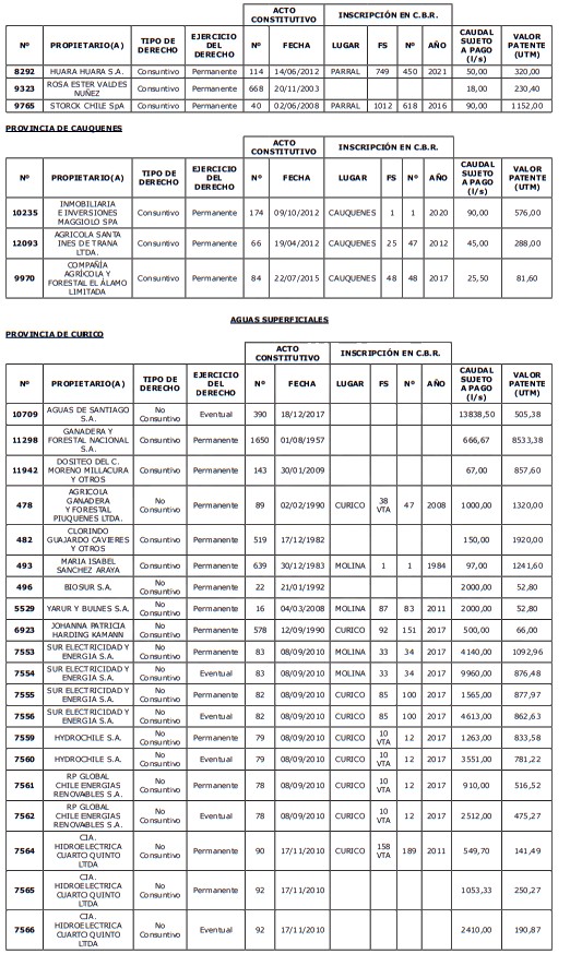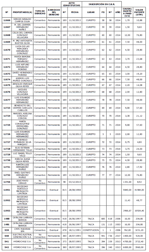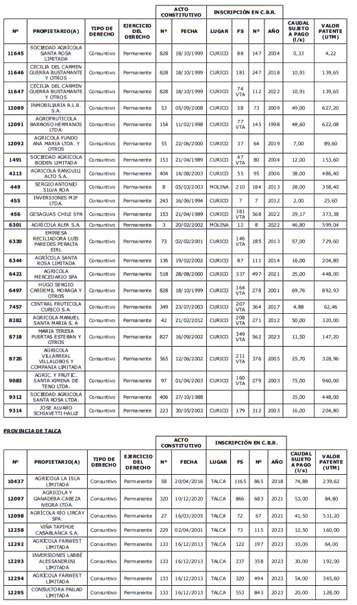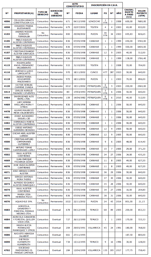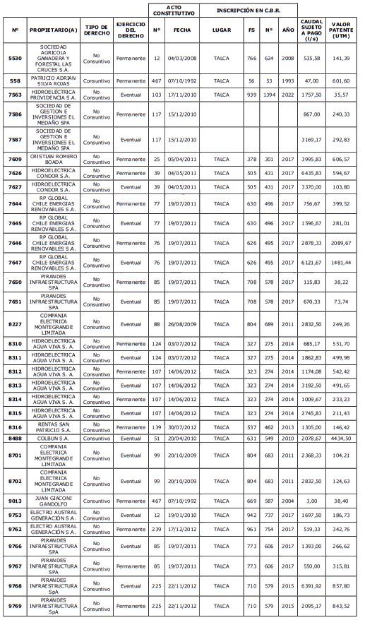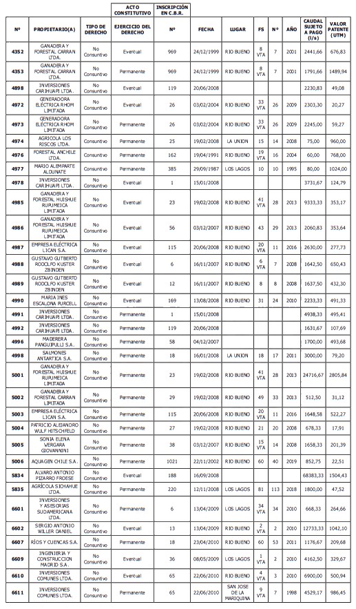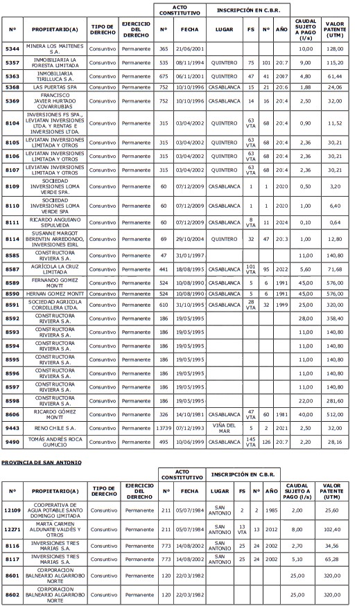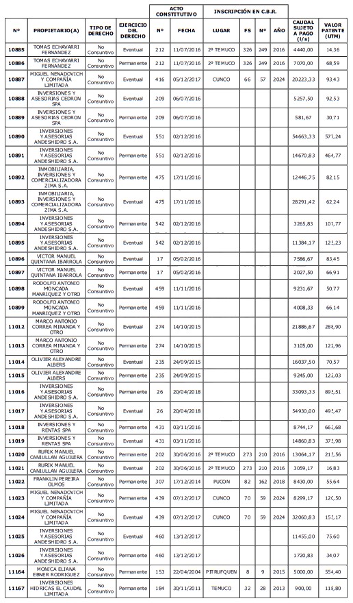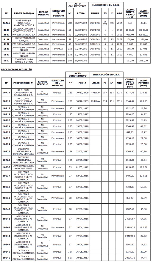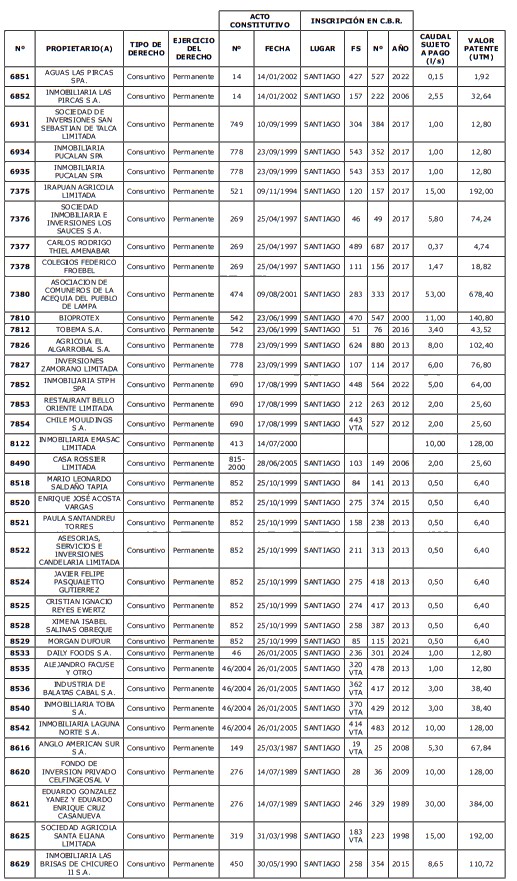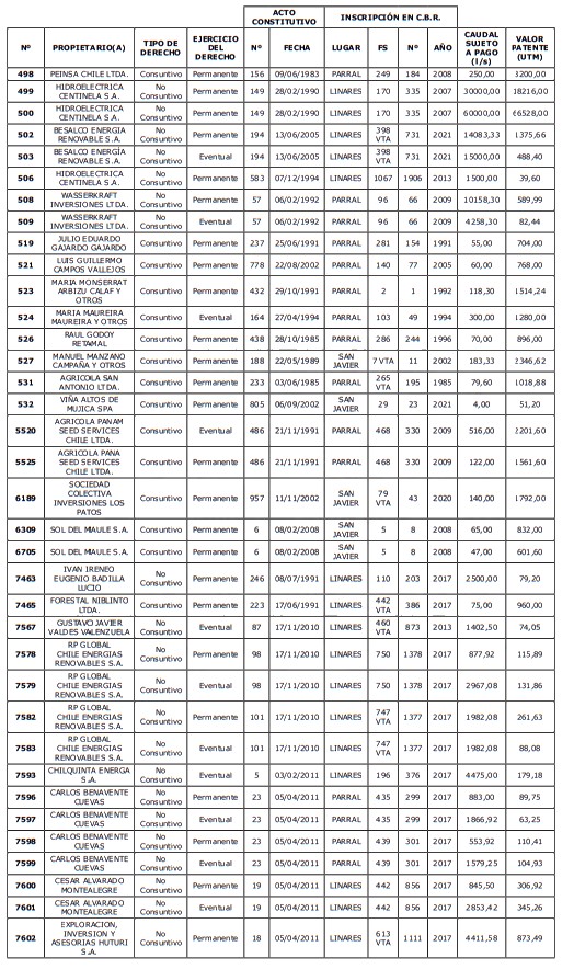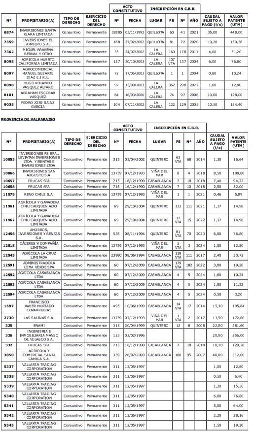 5. Déjase constancia que según establece el artículo 129 bis 7 del Código de Aguas, las personas, tanto naturales como jurídicas, que han sido identificadas en el presente listado, deberán pagar la patente dentro del mes de marzo de 2026 en cualquier banco o institución autorizada para recaudar tributos. Asimismo, de no mediar el pago en la fecha establecida para ello, se iniciará un procedimiento judicial para efectuar un remate público del respectivo derecho, conforme señala el artículo 129 bis 11 del mismo cuerpo legal.