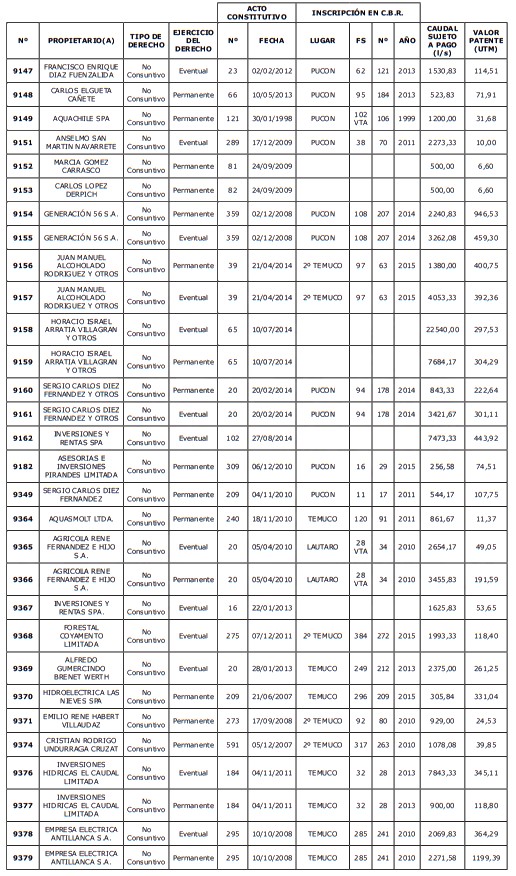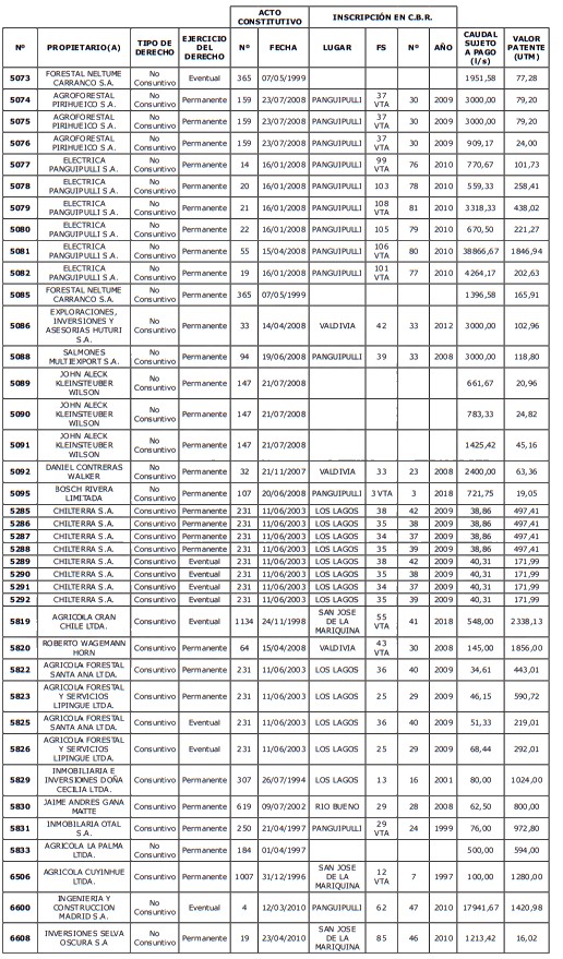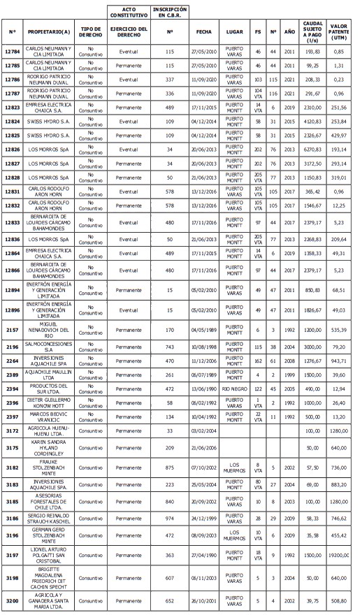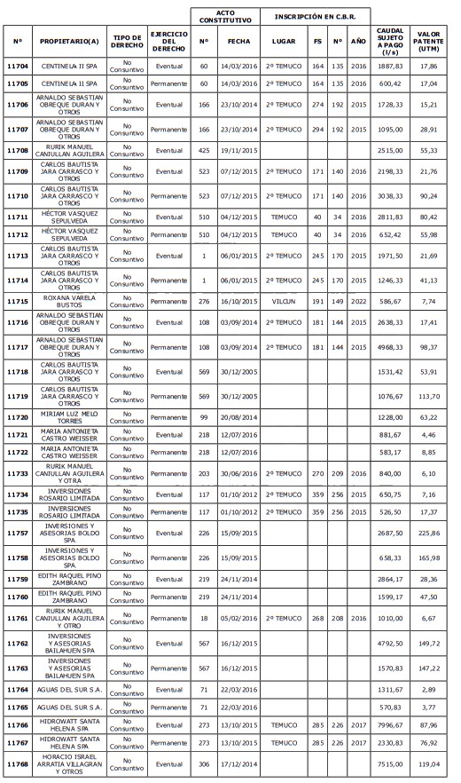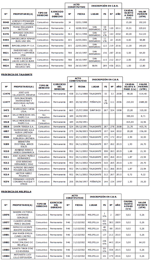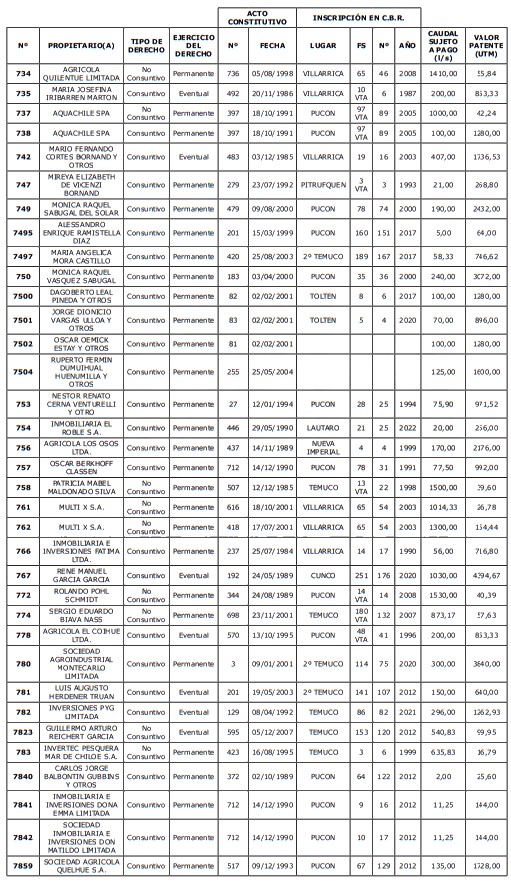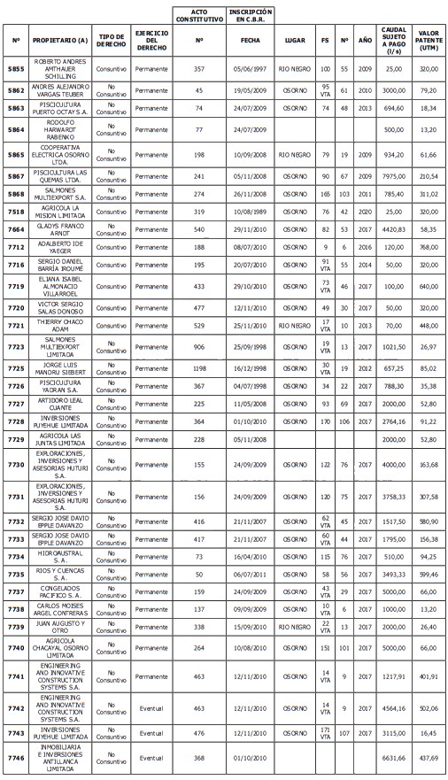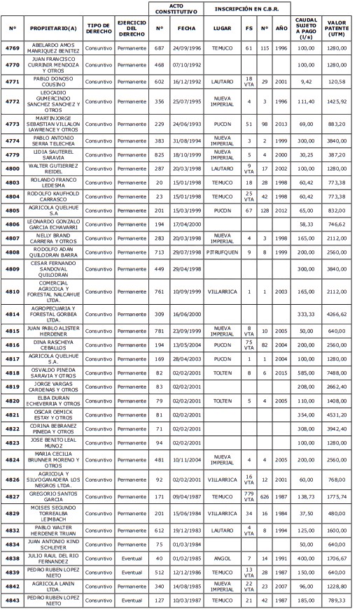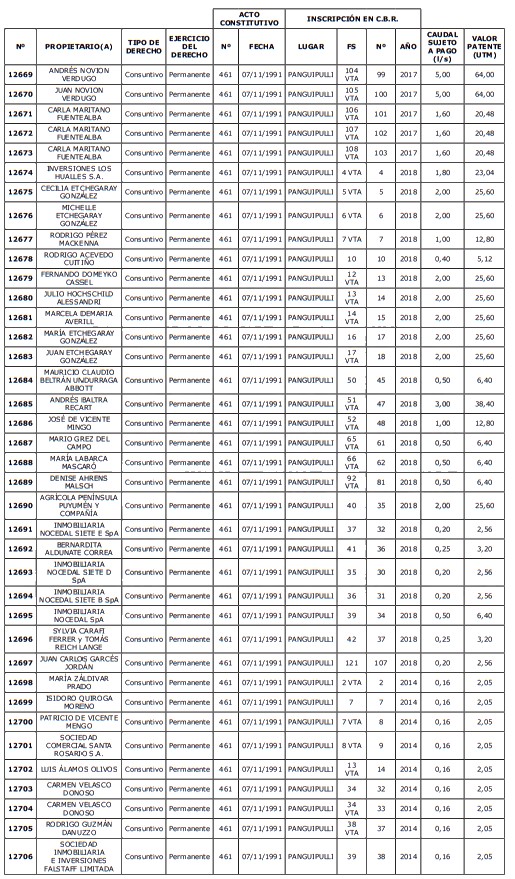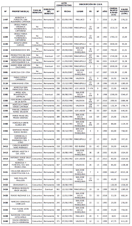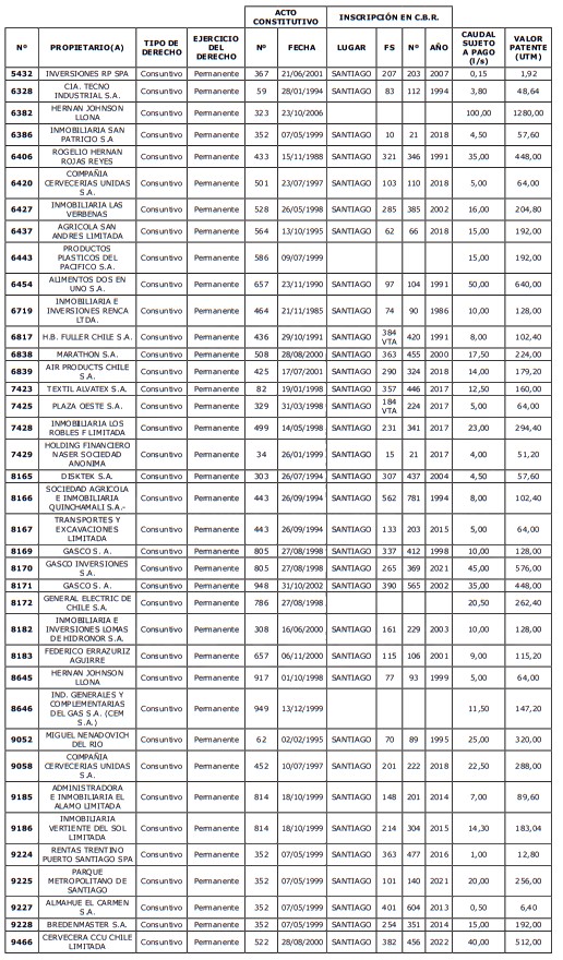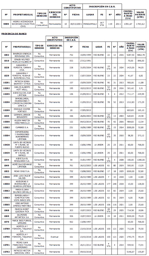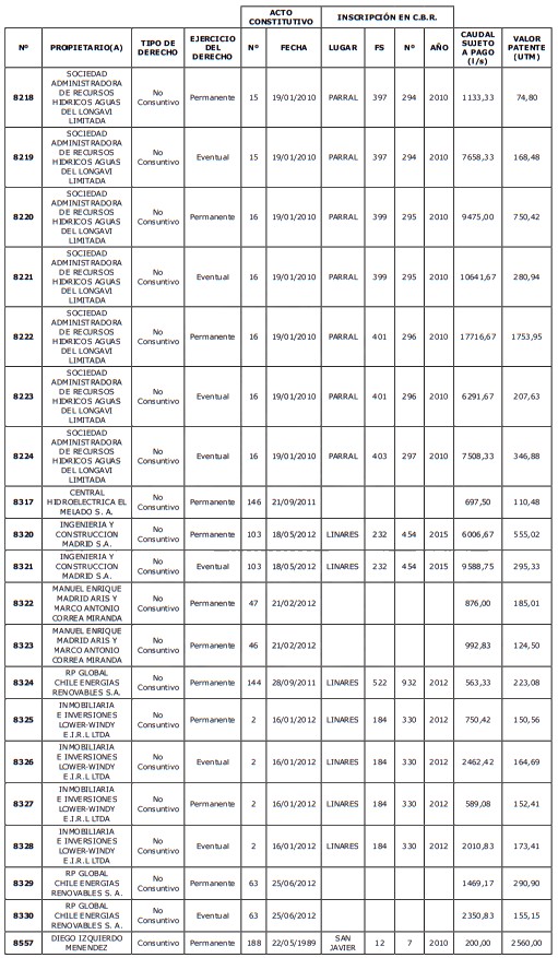 5. Déjase constancia que según establece el artículo 129 bis 7 del Código de Aguas, las personas, tanto naturales como jurídicas, que han sido identificadas en el presente listado, deberán pagar la patente dentro del mes de marzo de 2026 en cualquier banco o institución autorizada para recaudar tributos. Asimismo, de no mediar el pago en la fecha establecida para ello, se iniciará un procedimiento judicial para efectuar un remate público del respectivo derecho, conforme señala el artículo 129 bis 11 del mismo cuerpo legal.