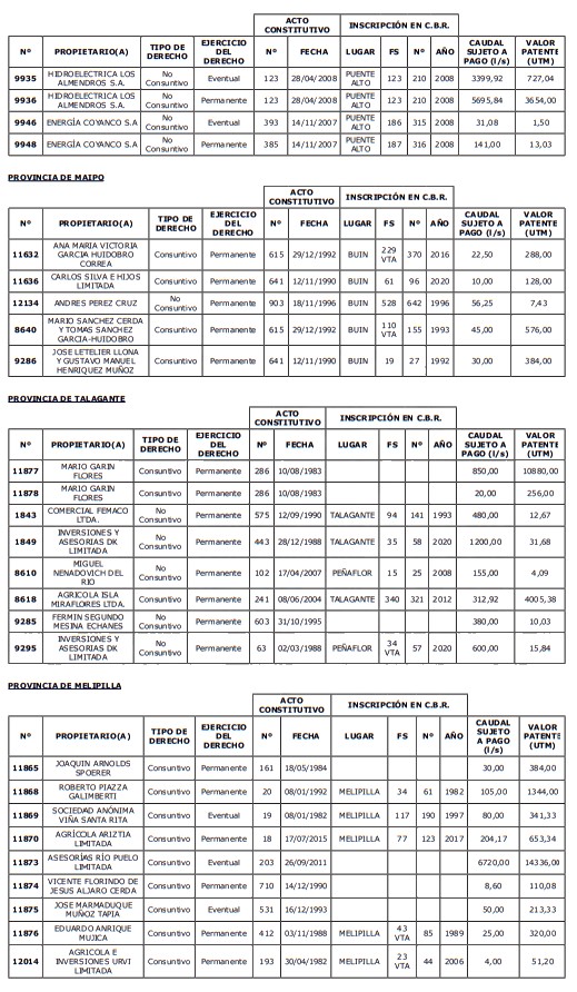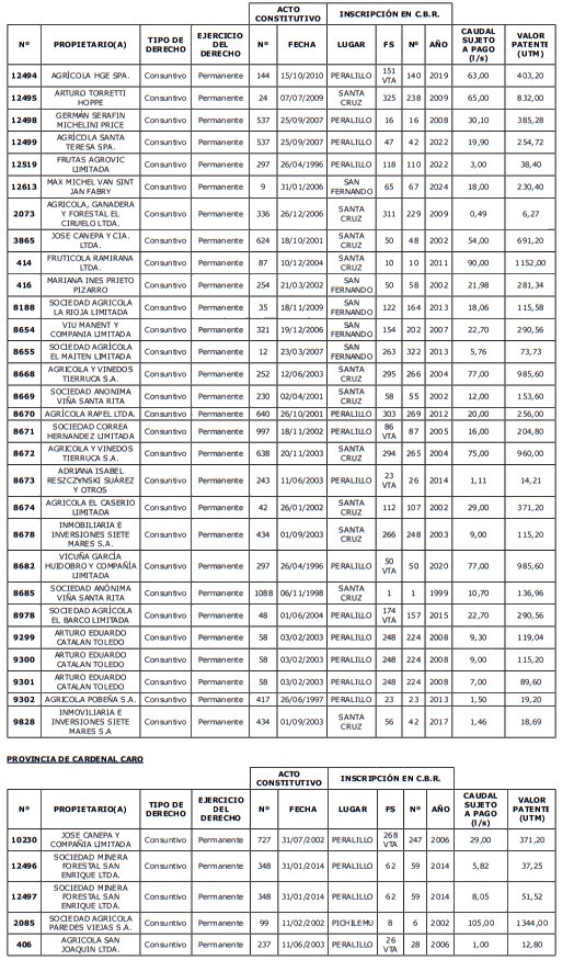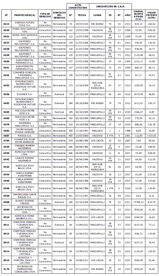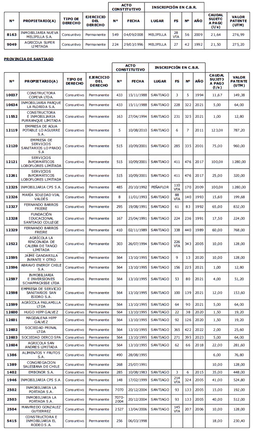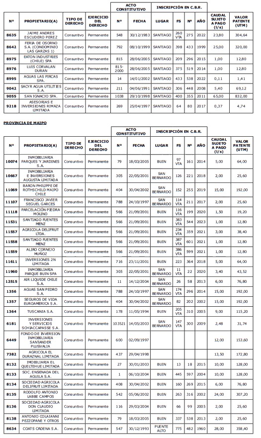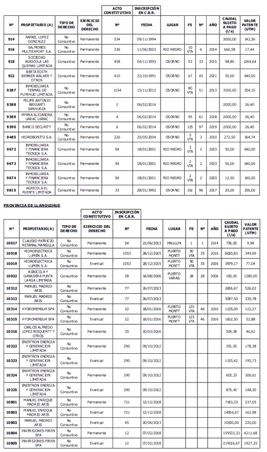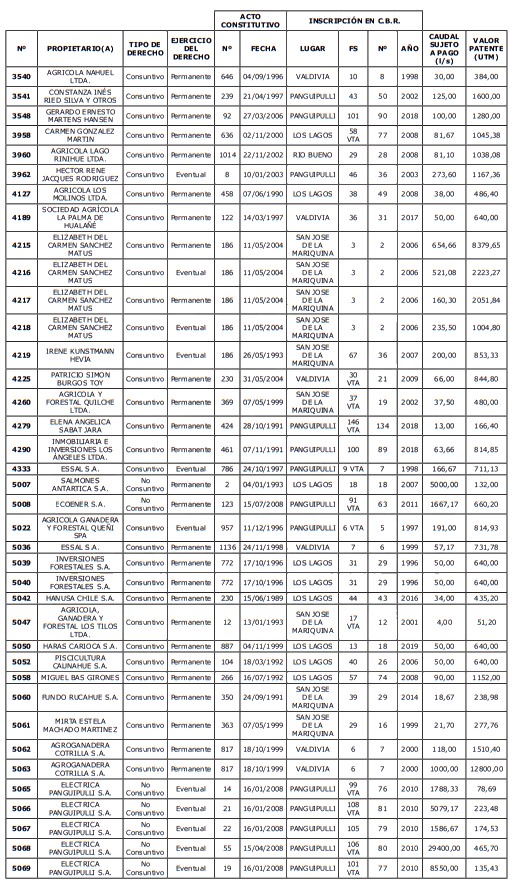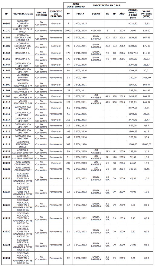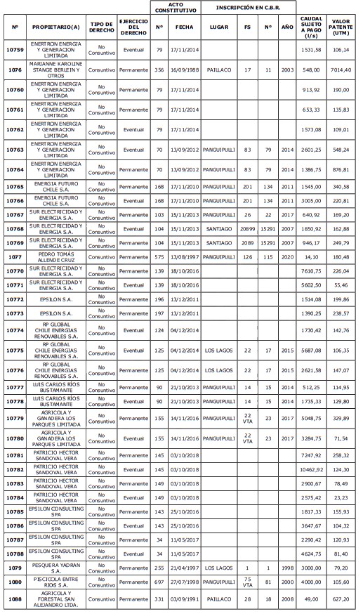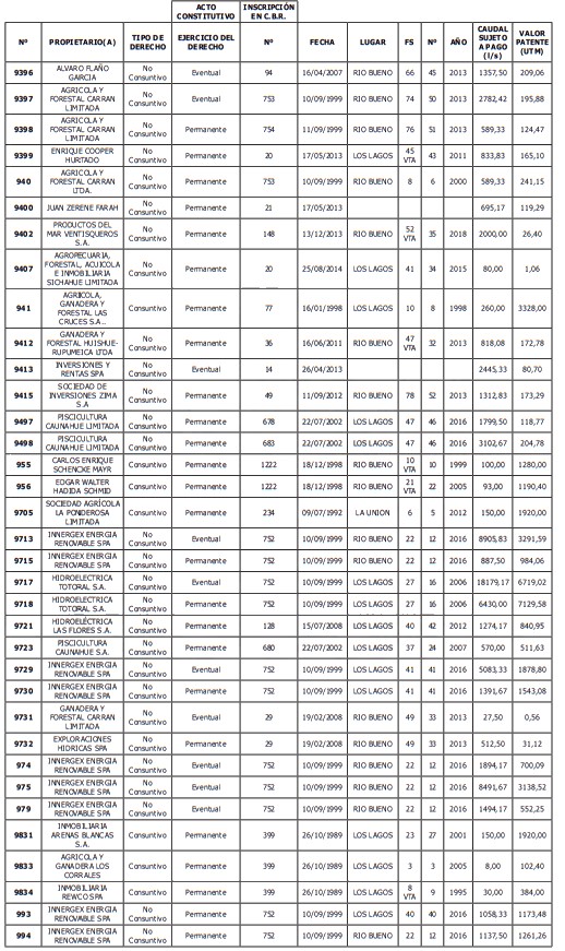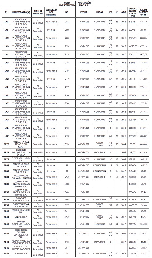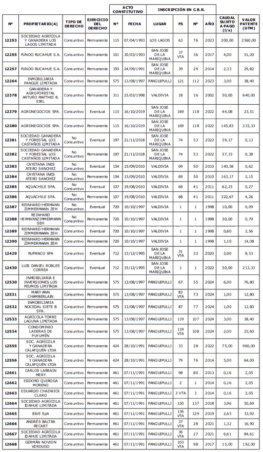 5. Déjase constancia que según establece el artículo 129 bis 7 del Código de Aguas, las personas, tanto naturales como jurídicas, que han sido identificadas en el presente listado, deberán pagar la patente dentro del mes de marzo de 2026 en cualquier banco o institución autorizada para recaudar tributos. Asimismo, de no mediar el pago en la fecha establecida para ello, se iniciará un procedimiento judicial para efectuar un remate público del respectivo derecho, conforme señala el artículo 129 bis 11 del mismo cuerpo legal.