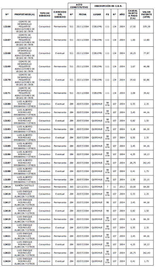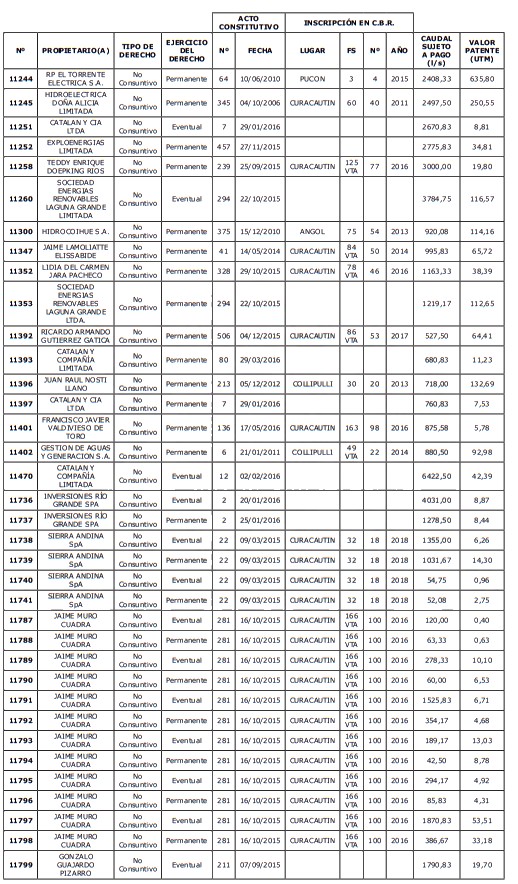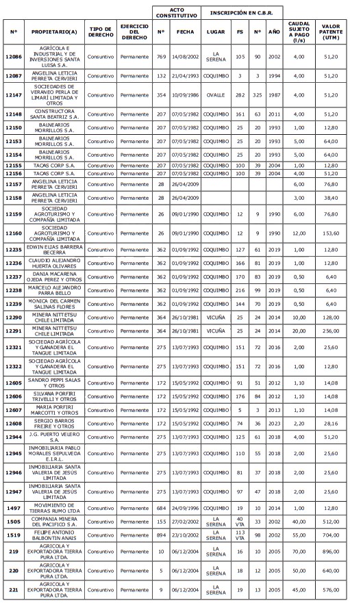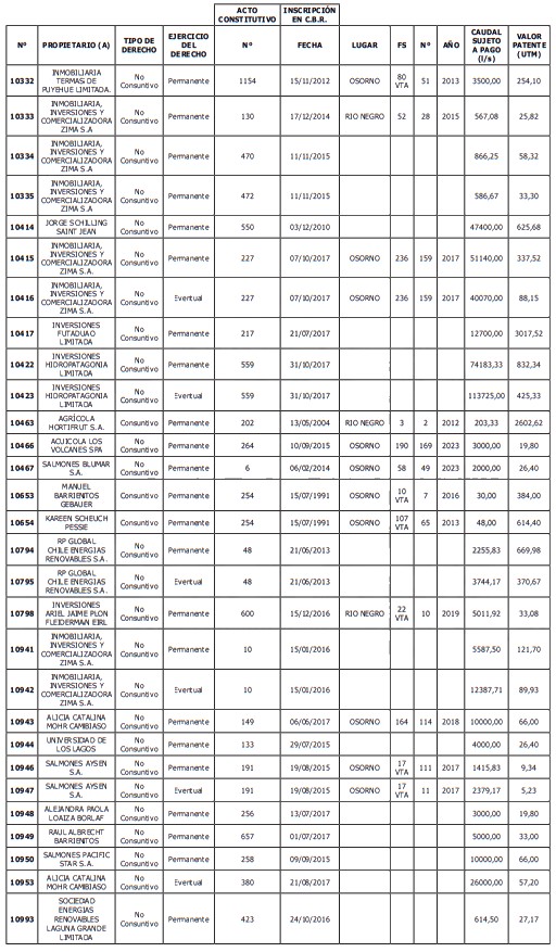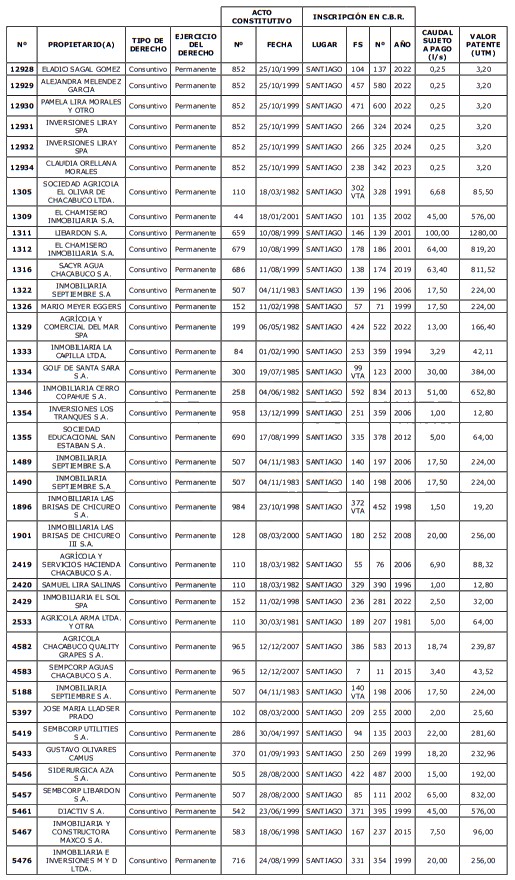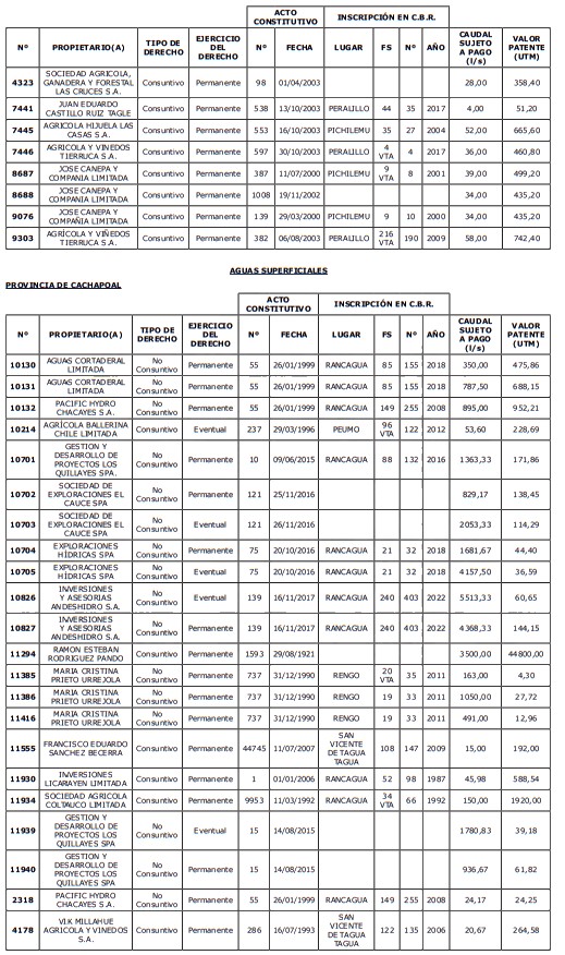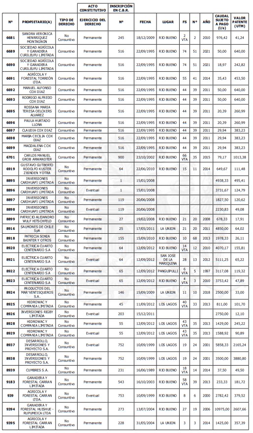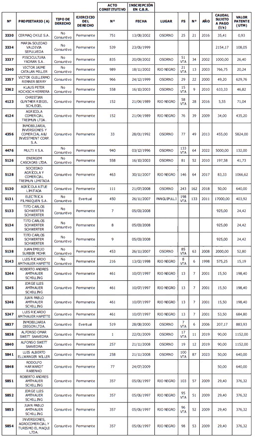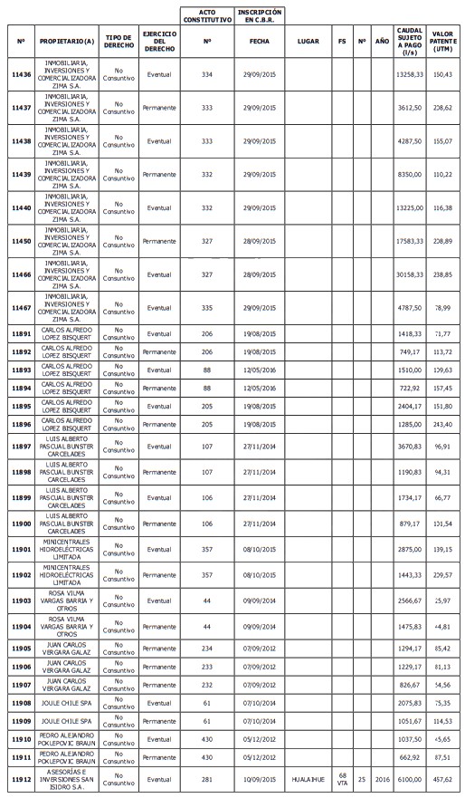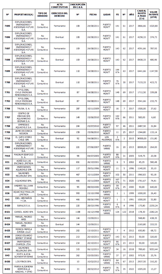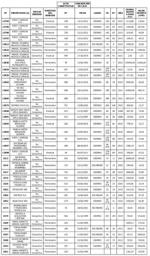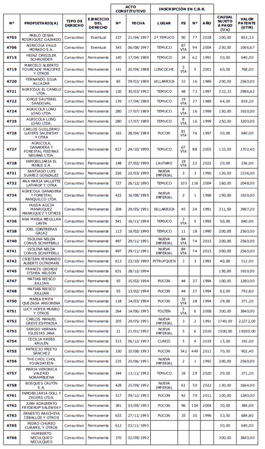 5. Déjase constancia que según establece el artículo 129 bis 7 del Código de Aguas, las personas, tanto naturales como jurídicas, que han sido identificadas en el presente listado, deberán pagar la patente dentro del mes de marzo de 2026 en cualquier banco o institución autorizada para recaudar tributos. Asimismo, de no mediar el pago en la fecha establecida para ello, se iniciará un procedimiento judicial para efectuar un remate público del respectivo derecho, conforme señala el artículo 129 bis 11 del mismo cuerpo legal.