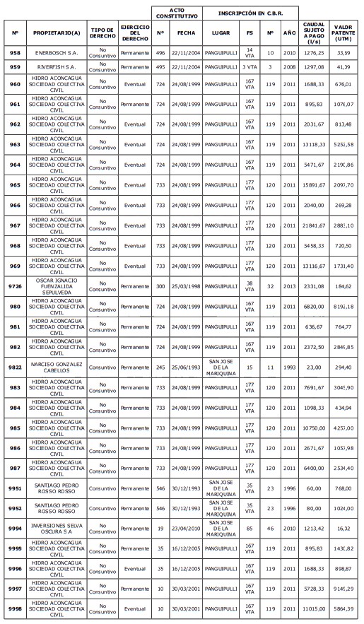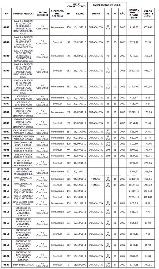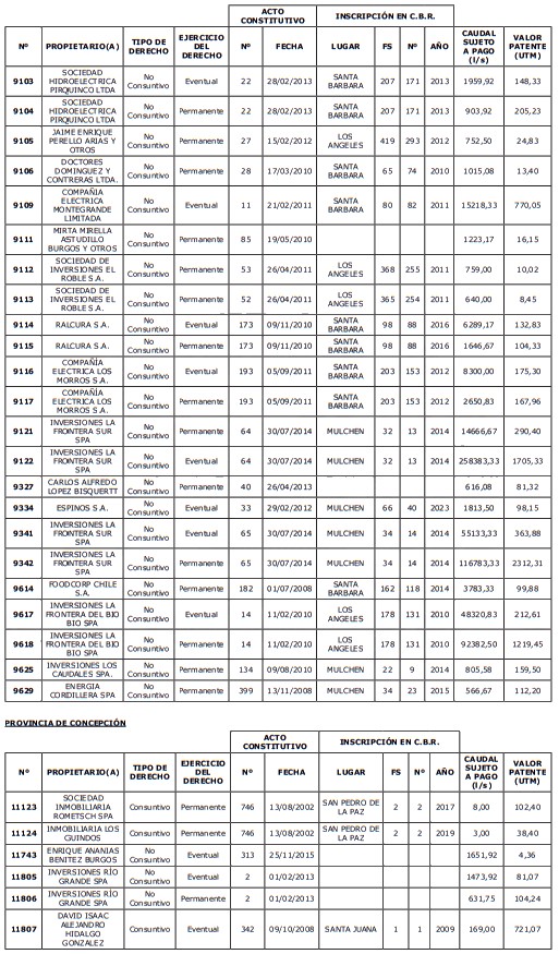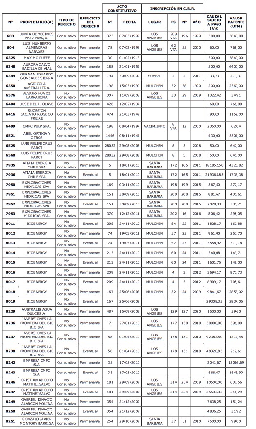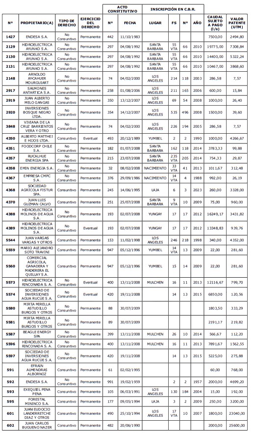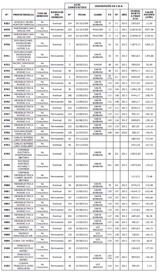1. Que, acorde a lo previsto en el artículo 129 bis 8 del Código de Aguas, corresponde al Director General de Aguas, previa consulta a la organización de usuarios respectiva, determinar los derechos de aprovechamiento cuyas aguas no se encuentren total o parcialmente utilizadas al 31 de agosto de cada año, para lo cual deberá confeccionar un listado con los derechos afectos al pago de patente.
