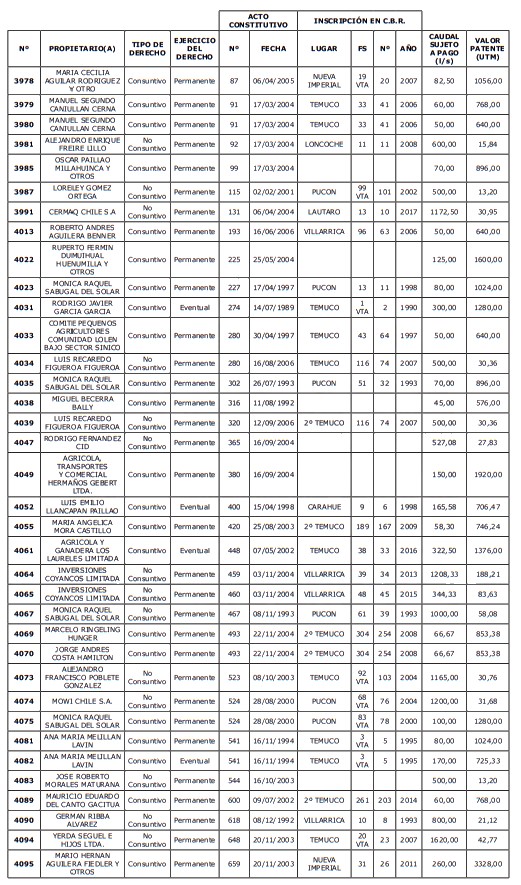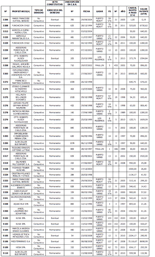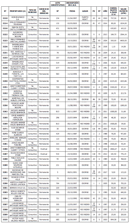 3. Que, por disposición del artículo 129 bis 7 del Código de Aguas, la Dirección General de Aguas debe publicar la resolución que contenga el listado de derechos de aprovechamiento de aguas afectos a la obligación de pagar una patente a beneficio fiscal, por la no utilización total o parcial de las aguas.