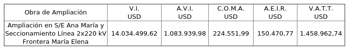FIJA NUEVO VALOR DE INVERSIÓN Y VALORES DE LAS COMPONENTES DEL NUEVO VALOR ANUAL DE LA TRANSMISIÓN POR TRAMO DE LA OBRA "AMPLIACIÓN EN S/E ANA MARÍA Y SECCIONAMIENTO LÍNEA 2X220 KV FRONTERA - MARÍA ELENA", SUS FÓRMULAS DE INDEXACIÓN Y ACTUALIZA CRONOGRAMA DE EJECUCIÓN