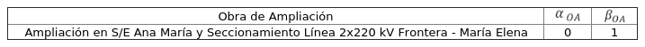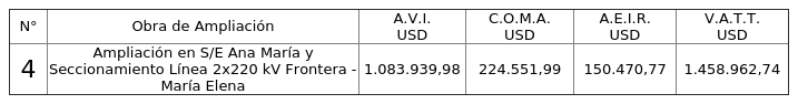 El C.O.M.A. determinado para la obra "Ampliación en S/E Ana María y Seccionamiento Línea 2x220 kV Frontera - María Elena" será remunerado hasta la entrada en vigencia del decreto tarifario correspondiente al período 2024 - 2027, conforme lo establecido en el quinto inciso del artículo 99º de la Ley General de Servicios Eléctricos, período en el cual el C.O.M.A. se determinará de acuerdo con lo que indiquen las respectivas bases que regulen el estudio de valorización a que hace referencia el artículo 107º de dicho cuerpo normativo. Lo mismo aplicará para el A.E.I.R, según lo establecido en el literal d) del artículo 49 del Reglamento de Valorización.