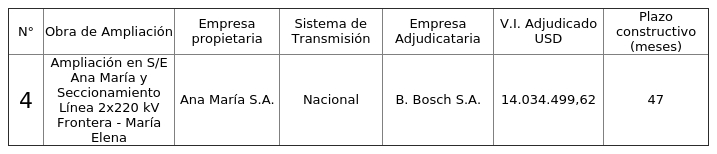 2. Que, el Coordinador realizó una licitación pública internacional de los derechos de construcción y ejecución de las obras de ampliación fijadas por el decreto exento Nº 171, en conformidad con lo dispuesto en el artículo 95º de la Ley General de Servicios Eléctricos, adjudicando la Obra de Ampliación a BBosch S.A. por un Valor de Inversión ("V.I.") de $12.026.135,06 dólares de los Estados Unidos de América ("USD").