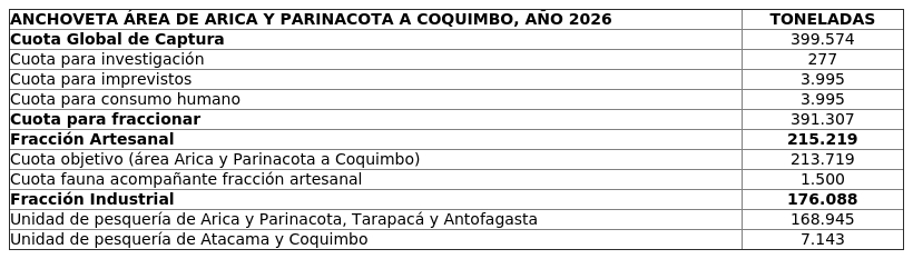 Por decreto exento N° 202500276, de este Ministerio, fíjase para el año 2026, las siguientes cuotas globales de captura, para las pesquerías de pequeños pelágicos de Anchoveta y Sardina española, en el área marítima comprendida por las regiones de Arica y Parinacota, de Tarapacá, de Antofagasta, de Atacama y de Coquimbo:
