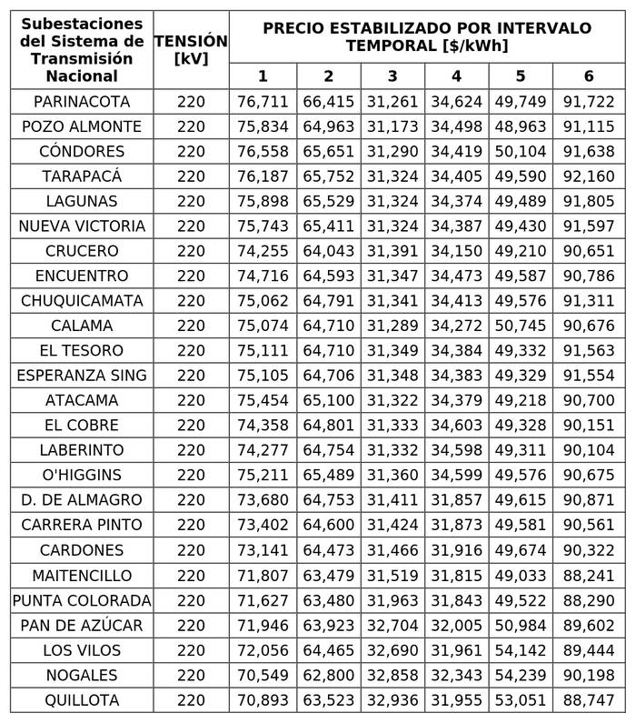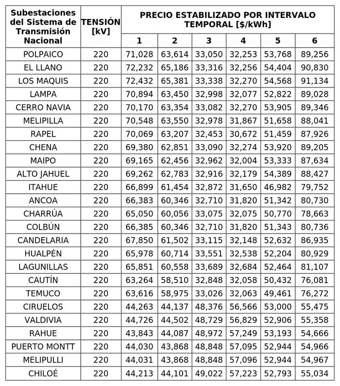 A continuación, se detallan los precios estabilizados por intervalo temporal aplicables a los medios de generación de pequeña escala, en las subestaciones denominadas "Subestaciones del Sistema de Transmisión Nacional" y para los niveles de tensión que se indican: