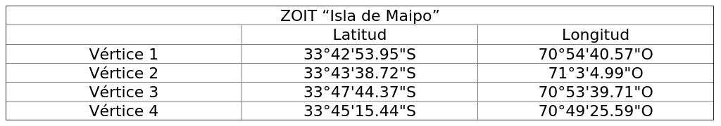 Artículo segundo: Los límites del territorio de la Zona de Interés Turístico "Isla de Maipo" están determinados por los siguientes vértices con sus coordenadas geográficas referenciales:
