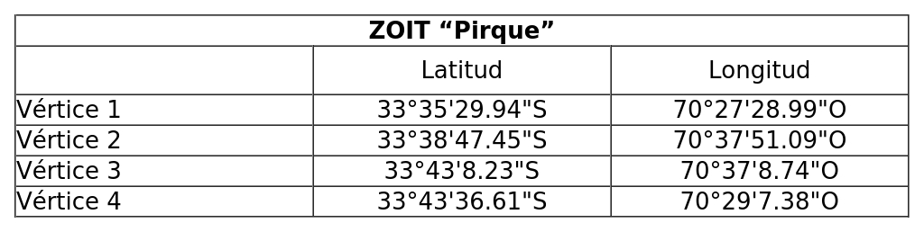 Artículo segundo: Los límites del territorio de la Zona de Interés Turístico "Pirque" están determinados por los siguientes vértices con sus coordenadas geográficas referenciales: