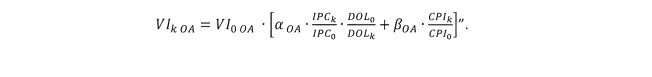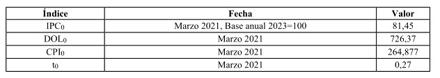 El subíndice 0 de las fórmulas anteriores corresponde al segundo mes anterior al mes del último día de recepción de ofertas del proceso en el cual fue adjudicada inicialmente la Obra de Ampliación, con el fin de conformar los valores base de los índices de forma tal que, al mes de la entrega de oferta, la aplicación de las fórmulas de indexación para el A.V.I., C.O.M.A. y A.E.I.R. dé como resultado el A.V.I., C.O.M.A. y A.E.I.R. que conforman el V.A.T.T. en cada una de sus componentes.