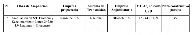 Cuarto: Actualízase el cronograma de ejecución de la obra "Ampliación en S/E Frontera y Seccionamiento Línea 2x220 kV Lagunas - Encuentro", en cuanto a que ésta deberá estar construida y entrar en operación, a más tardar, el día 17 de marzo de 2026.