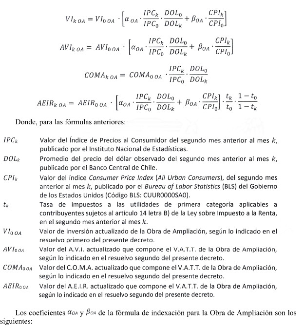 El nuevo A.V.I., C.O.M.A. y A.E.I.R. de la obra "Ampliación en S/E Frontera y Seccionamiento Línea 2x220 kV Lagunas - Encuentro", fijados en los términos establecidos en el presente acto administrativo se reajustarán anualmente en dólares, según las siguientes fórmulas de indexación: