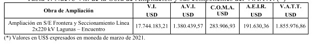 Segundo: Fíjase nuevo Valor Anual de la Transmisión por Tramo ("V.A.T.T.") y sus componentes, de la obra "Ampliación en S/E Frontera y Seccionamiento Línea 2x220 kV Lagunas - Encuentro", determinado originalmente mediante decreto N° 11T, de 2021, del Ministerio de Energía, conforme a lo establecido por la Comisión en su "Informe Técnico de Revisión del Valor de Inversión Adjudicado según el artículo segundo transitorio de la Ley Nº21.721 obra 'Ampliación S/E Frontera y Seccionamiento Línea 2x220 kV Lagunas - Encuentro"', aprobado mediante resolución exenta Nº 703, de 2025, de la Comisión.