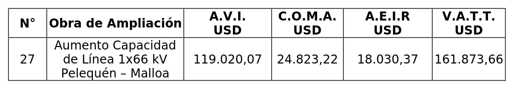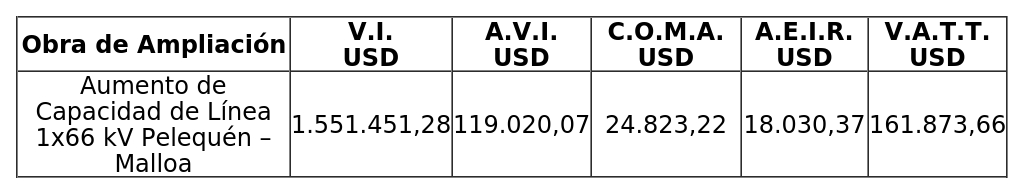 Segundo: Fíjase nuevo Valor Anual de la Transmisión por Tramo ("V.A.T.T.") y sus componentes, de la obra "Aumento de Capacidad de Línea 1x66 kV Pelequén - Malloa", determinado originalmente mediante decreto N°11T, de 2021, del Ministerio de Energía, conforme a lo establecido por la Comisión en su "Informe Técnico de Revisión del Valor de Inversión Adjudicado según el artículo segundo transitorio de la ley N°21.721 obra 'Aumento de Capacidad de Línea 1x66 kV Pelequén - Malloa'", aprobado mediante resolución exenta N°693, de 2025, de la Comisión.
