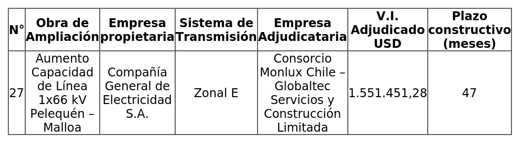 2. Que, el Coordinador realizó una licitación pública internacional de los derechos de construcción y ejecución de las obras de ampliación fijadas por el decreto exento N°293, en conformidad con lo dispuesto en el artículo 95° de la Ley General de Servicios Eléctricos, adjudicando la Obra de Ampliación a Consorcio Monlux Chile - Servicios Eléctricos Elecsa Limitada por un Valor de Inversión ("V.I.") de $973.767,16 dólares de los Estados Unidos de América ("USD").