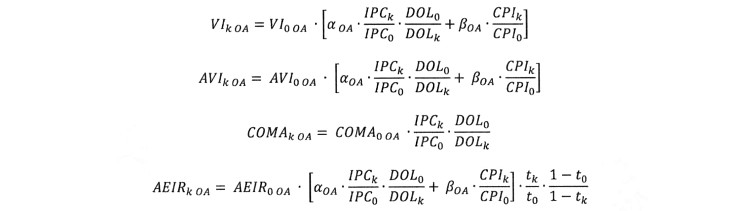 El subíndice 0 de las fórmulas anteriores corresponde al segundo mes anterior al mes del último día de recepción de ofertas del proceso en el cual fue adjudicada inicialmente la Obra de Ampliación, con el fin de conformar los valores base de los índices de forma tal que, al mes de la entrega de oferta, la aplicación de las fórmulas de indexación para el A.V.I., C.O.M.A. y A.E.I.R. dé como resultado el A.V.I., C.O.M.A. y A.E.I.R. que conforman el V.A.T.T. en cada una de sus componentes.