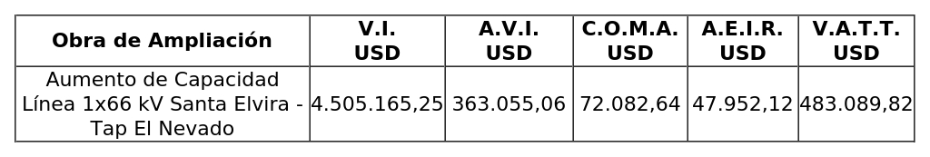 Tercero: Fíjanse las fórmulas de indexación del nuevo V.I., y de los componentes del nuevo V.A.T.T., de la obra "Aumento de Capacidad Línea 1x66 kV Santa Elvira - Tap El Nevado".