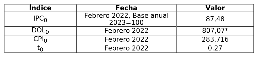 El subíndice 0 de las fórmulas anteriores corresponde al segundo mes anterior al mes del último día de recepción de ofertas del proceso en el cual fue adjudicada inicialmente la Obra de Ampliación, con el fin de conformar los valores base de los índices de forma tal que, al mes de la entrega de oferta, la aplicación de las fórmulas de indexación para el A.V.I., C.O.M.A. y A.E.I.R. dé como resultado el A.V.I., C.O.M.A. y A.E.I.R. que conforman el V.A.T.T. en cada una de sus componentes.