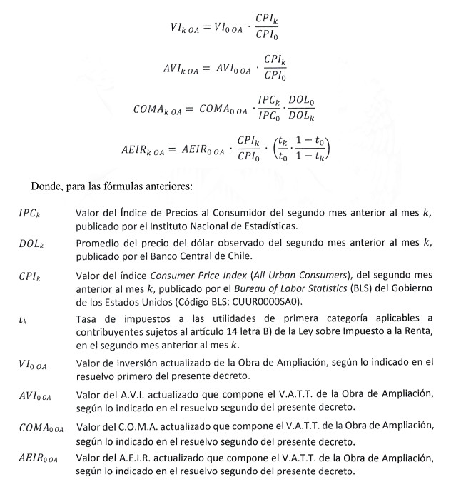 "La fórmula de indexación del V.I. de las obras 'Ampliación en S/E Pichirropulli (RTR ATMT)', 'Ampliación en S/E Temuco (NTR ATMT)', 'Ampliación en S/E Chiloé y tendido segundo circuito Línea 2x220 kV Nuevo Ancud - Chiloé' y 'Aumento de Capacidad Línea 1x66 kV Santa Elvira - Tap El Nevado' fijados en los términos establecidos en el presente acto administrativo será la siguiente: