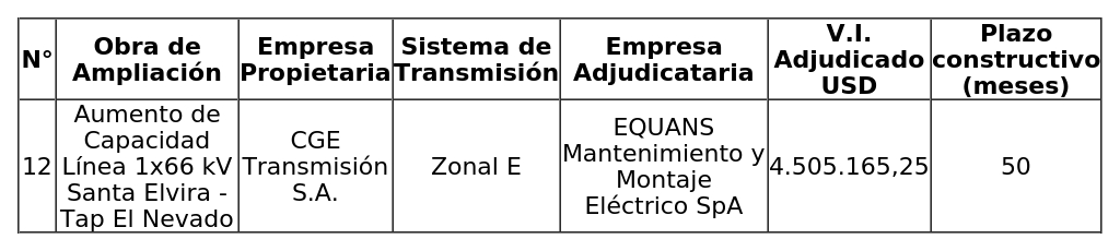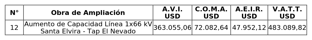 "La fórmula de indexación del V.I. de las obras 'Ampliación en S/E Pichirropulli (RTR ATMT)', 'Ampliación en S/E Temuco (NTR ATMT)', 'Ampliación en S/E Chiloé y tendido segundo circuito Línea 2x220 kV Nuevo Ancud - Chiloé' y 'Aumento de Capacidad Línea 1x66 kV Santa Elvira - Tap El Nevado' fijados en los términos establecidos en el presente acto administrativo será la siguiente: