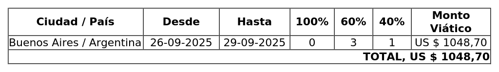 Que, durante su estadía en la ciudad de Buenos Aires, Argentina, no se pagarán viáticos por concepto de alimentación correspondientes a los días 26, 27 y 28 de septiembre de 2025, por cuanto dichos gastos fueron cubiertos por el organismo invitante, la Federación Argentina de Empresarios de Viajes y Turismo (FAEVYT) y la Asociación de Agencias de Viajes y Turismo de Buenos Aires (AVIABUE).