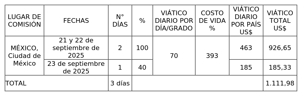 2. Que, la señora Ministra de Agricultura es comisionada a México, considerando el pago de viáticos por la suma de US$ 1.111,98, correspondiente a 2 días al 100% y 1 día al 40%.