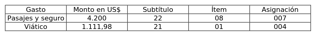 5. Que, el viático asociado al cometido de la señora Ministra, representa el siguiente gasto: