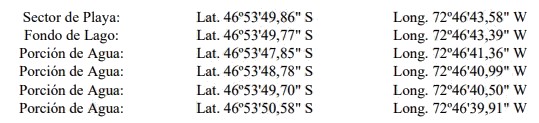 Decreto exento Nº 590, de fecha 30 de octubre de 2025 del Ministerio de Defensa Nacional, Subsecretaría para las Fuerzas Armadas, el cual otorgó a Holding Tres Lagos Ltda., sociedad chilena, RUT 76.785.040-3, concesión marítima menor sobre un sector de playa, fondo de lago, porción de agua y uso de mejora fiscal en el lugar denominado El Maitén - Lago General Carrera, comuna de Chile Chico, provincia de General Carrera, Región de Aysén del General Carlos Ibáñez del Campo, con vencimiento el 31 de diciembre de 2030, con una superficie total de 27,78 m² de playa, 79,48 m² de fondo de lago y porción de agua será la necesaria para instalar boyas, la que fue tramitada ante la Subsecretaría para las Fuerzas Armadas, con el número de solicitud CM61446. A modo referencial se señalan las siguientes coordenadas geográficas: