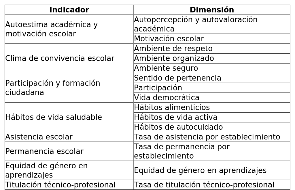1. Reemplázase, en el anexo de su artículo único la sección titulada "3. REQUISITOS QUE DEBEN CUMPLIR LOS OTROS INDICADORES DE CALIDAD EDUCATIVA", el cuadro con el encabezado "Los Otros Indicadores de Calidad Educativa y las dimensiones que lo conforman son:" por el siguiente: